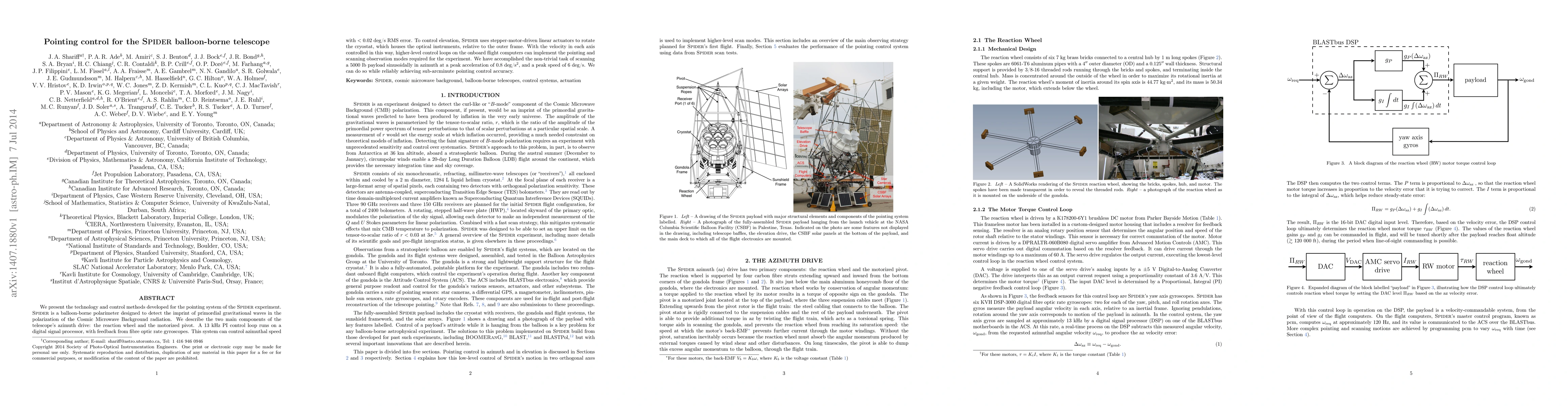The SPIDER balloon-borne telescope employs a sophisticated pointing control system using reaction wheels and motorized pivots, achieving <0.02 deg/s RMS azimuthal error, and stepper-motor-driven linear actuators for elevation control, enabling precise scanning of a 5000 lb payload.