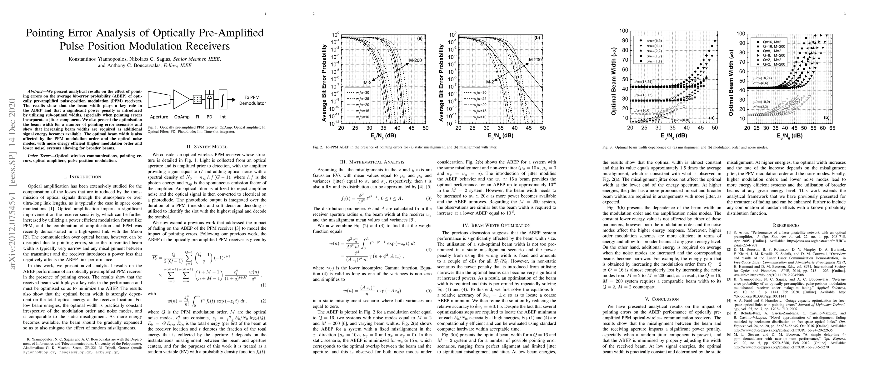 This paper analyzes the impact of pointing errors on the average bit-error probability in optically pre-amplified pulse-position modulation receivers, highlighting that beam width significantly affects performance and that sub-optimal widths introduce a power penalty. The study also optimizes beam width under various error scenarios and finds that higher modulation orders and lower noise allow for broader, more efficient beams.