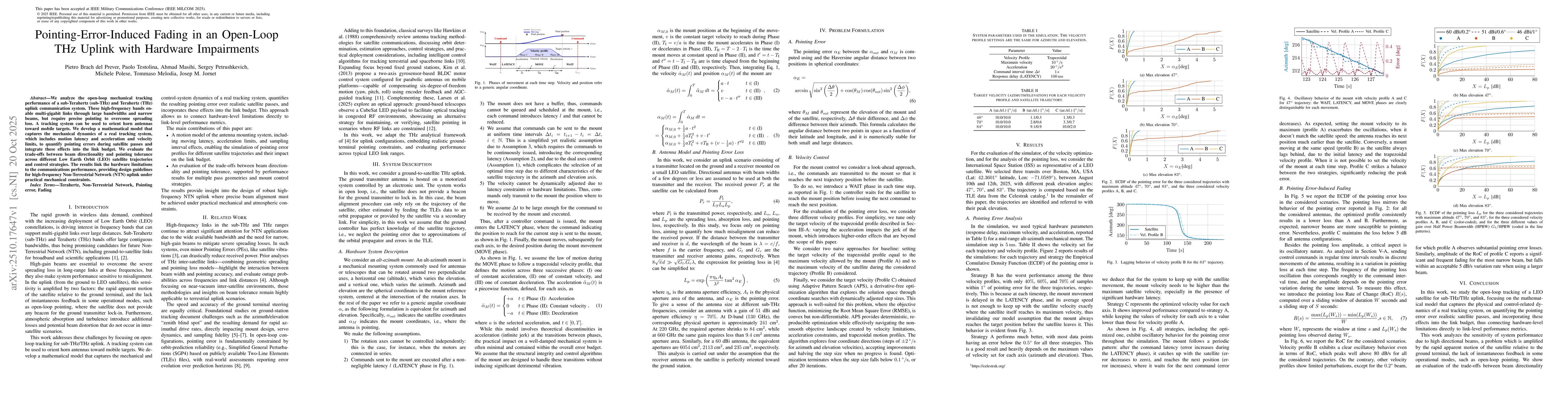 Develops a trapezoidal velocity profile model with latency and acceleration constraints to quantify pointing errors in open-loop THz uplink systems