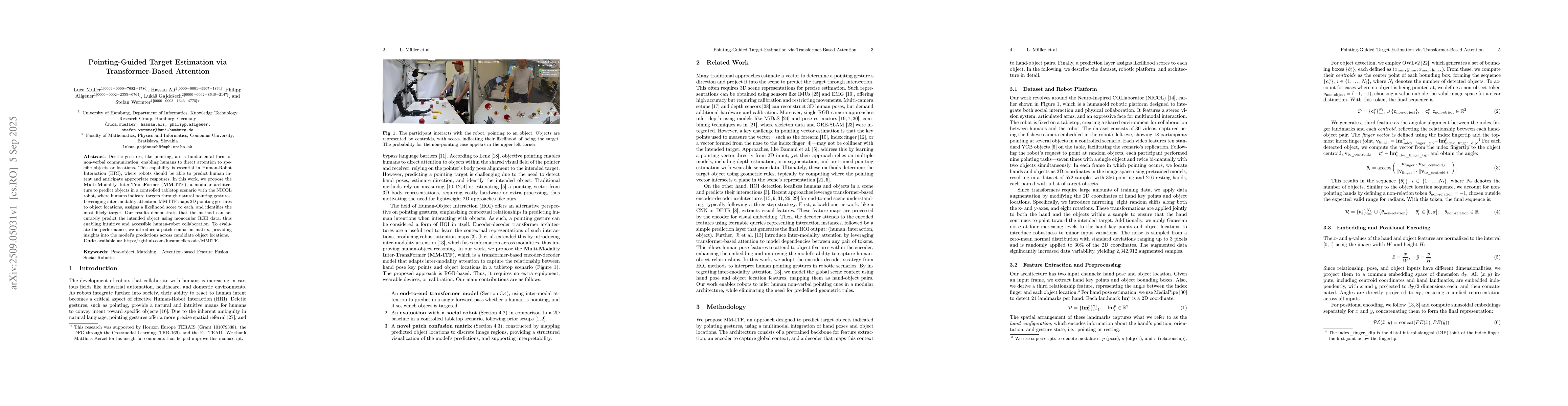 Deictic gestures, like pointing, are a fundamental form of non-verbal communication, enabling humans to direct attention to specific objects or locations. This capability is essential in Human-Robot Interaction (HRI), where robots should be able to predict human intent and anticipate appropriate responses. In this work, we propose the Multi-Modality Inter-TransFormer (MM-ITF), a modular architecture to predict objects in a controlled tabletop scenario with the NICOL robot, where humans indicate targets through natural pointing gestures. Leveraging inter-modality attention, MM-ITF maps 2D pointing gestures to object locations, assigns a likelihood score to each, and identifies the most likely target. Our results demonstrate that the method can accurately predict the intended object using monocular RGB data, thus enabling intuitive and accessible human-robot collaboration. To evaluate the performance, we introduce a patch confusion matrix, providing insights into the model's predictions across candidate object locations. Code available at: https://github.com/lucamuellercode/MMITF.