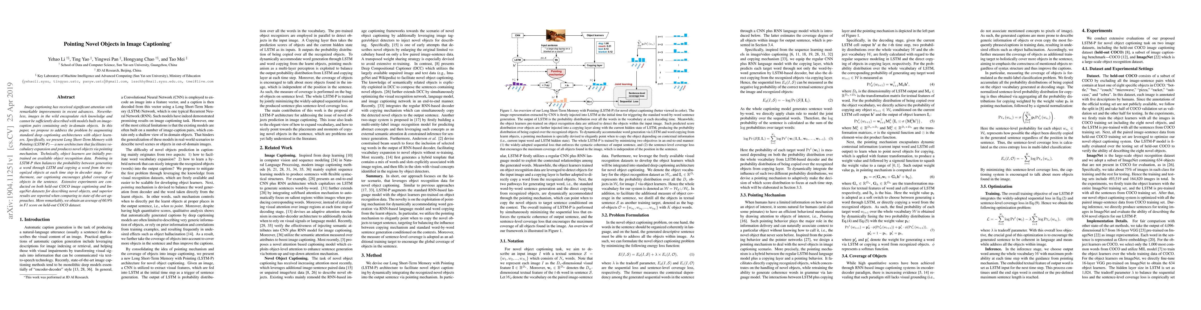 Image captioning has received significant attention with remarkable improvements in recent advances. Nevertheless, images in the wild encapsulate rich knowledge and cannot be sufficiently described with models built on image-caption pairs containing only in-domain objects. In this paper, we propose to address the problem by augmenting standard deep captioning architectures with object learners. Specifically, we present Long Short-Term Memory with Pointing (LSTM-P) --- a new architecture that facilitates vocabulary expansion and produces novel objects via pointing mechanism. Technically, object learners are initially pre-trained on available object recognition data. Pointing in LSTM-P then balances the probability between generating a word through LSTM and copying a word from the recognized objects at each time step in decoder stage. Furthermore, our captioning encourages global coverage of objects in the sentence. Extensive experiments are conducted on both held-out COCO image captioning and ImageNet datasets for describing novel objects, and superior results are reported when comparing to state-of-the-art approaches. More remarkably, we obtain an average of 60.9% in F1 score on held-out COCO~dataset.