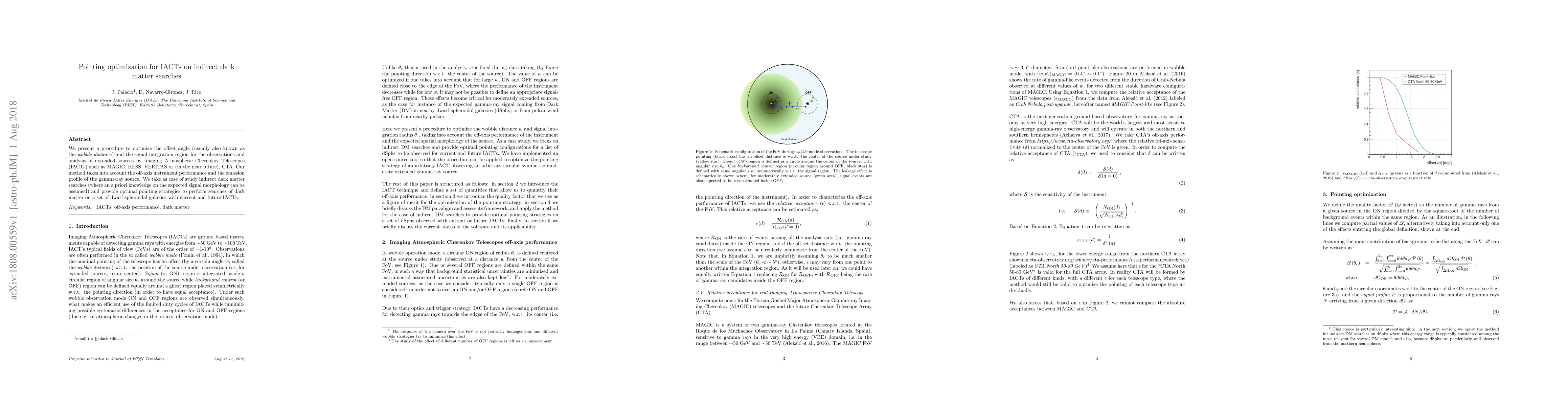 This paper proposes a method to optimize the wobble distance and signal integration for Imaging Atmospheric Cherenkov Telescopes (IACTs) in indirect dark matter searches, considering instrument performance and gamma-ray source profiles. It provides optimal pointing strategies for current and future IACTs in observing dwarf spheroidal galaxies.