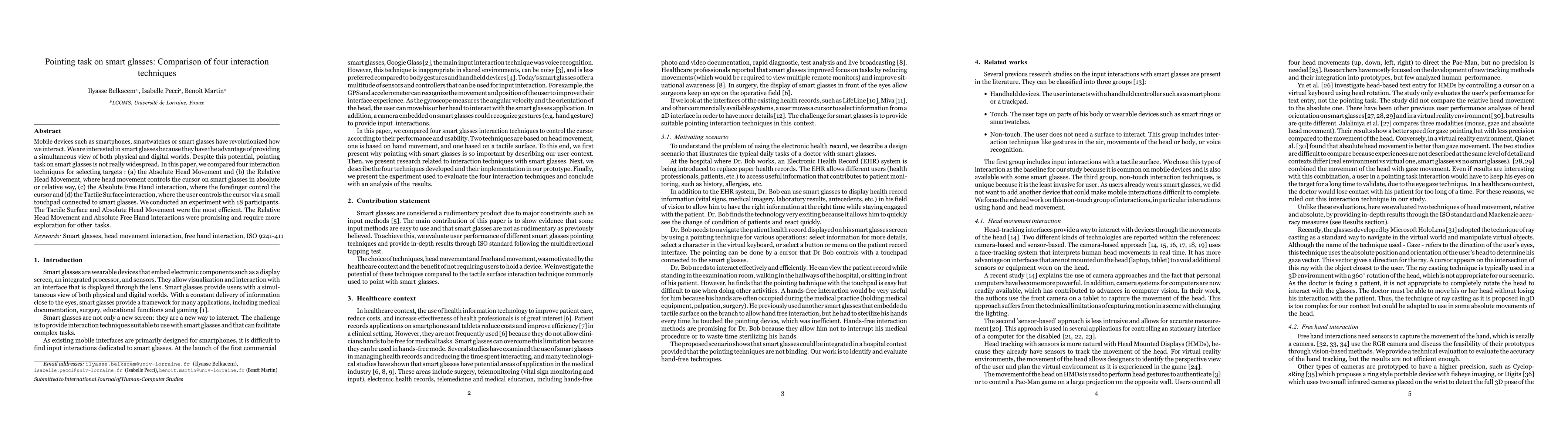 This study compares four interaction techniques for selecting targets on smart glasses: Absolute Head Movement, Relative Head Movement, Absolute Free Hand, and Tactile Surface. The Tactile Surface and Absolute Head Movement techniques proved most efficient, while Relative Head Movement and Absolute Free Hand showed potential for further exploration in different tasks.