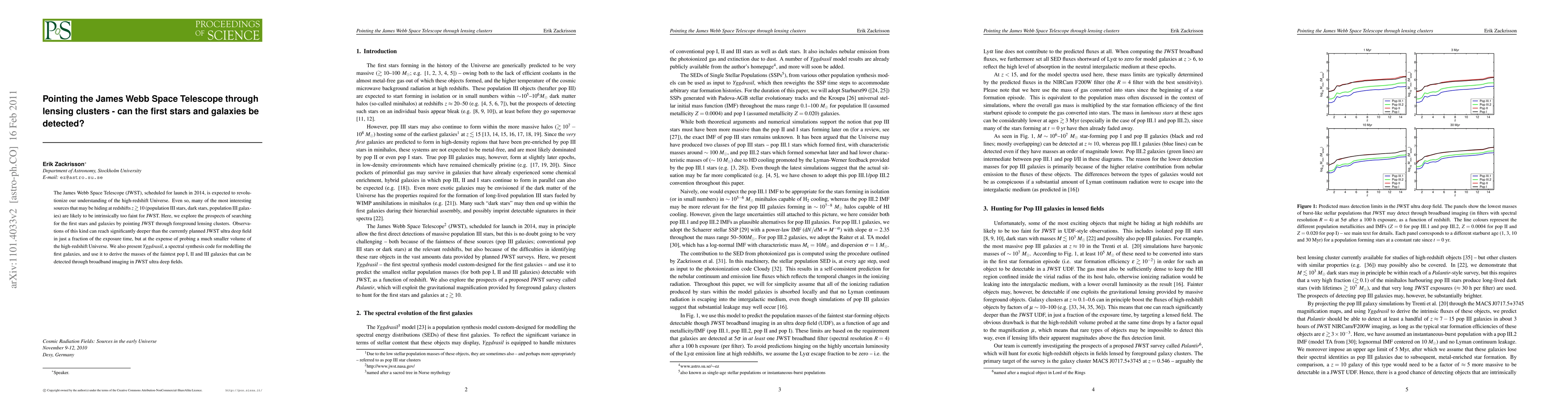This paper investigates the potential of using gravitational lensing clusters to detect the first stars and galaxies with the James Webb Space Telescope (JWST), which can reach deeper than planned ultra-deep fields in shorter exposure times. The study also introduces Yggdrasil, a spectral synthesis code to model early galaxies, and estimates the masses of the faintest galaxies detectable by JWST.