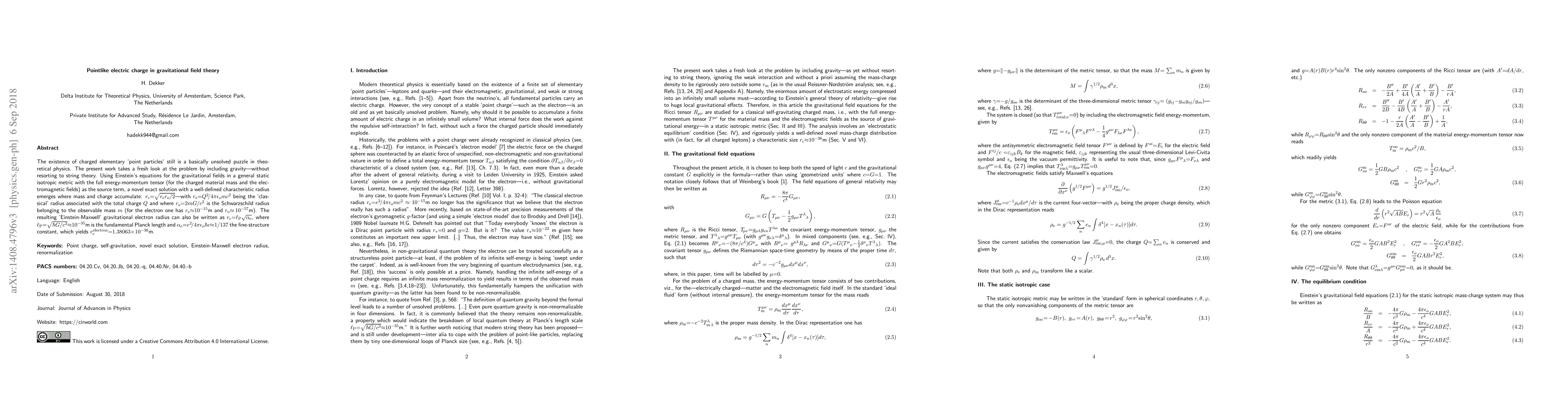 The existence of charged elementary 'point particles' still is a basically unsolved puzzle in theoretical physics. The present work takes a fresh look at the problem by including gravity---without resorting to string theory. Using Einstein's equations for the gravitational fields in a general static isotropic metric with the full energy-momentum tensor (for the charged material mass and the electromagnetic fields) as the source term, a novel exact solution with a well-defined characteristic radius emerges where mass and charge accumulate: $r_{\rm c}{=}\sqrt{r_{\rm e}r_o/2}$---with $r_{\rm e}{=}Q^2\!/4\pi\epsilon_omc^2$ being the 'classical' radius associated with the total charge $Q$ and where $r_o{=}2mG/c^2$ is the Schwarzschild radius belonging to the observable mass $m$ (for the electron one has $r_{\rm e}{\approx}10^{-15}$m and $r_o{\approx}\,10^{-57}$m). The resulting 'Einstein-Maxwell' gravitational electron radius can also be written as $r_{\rm c}{=}\ell_{\rm P}\sqrt{\alpha_{\rm e}}$, where $\ell_{\rm P}{=}\sqrt{\hbar G/c^3}{\approx}10^{-35}$m is the fundamental Planck length and $\alpha_{\rm e}{=}e^2\!/4\pi\epsilon_o\hbar c{\approx}1/137$ the fine-structure constant, which yields $r_{\rm c}^{\rm electron}{=}1.38063{\times}10^{-36}$m.