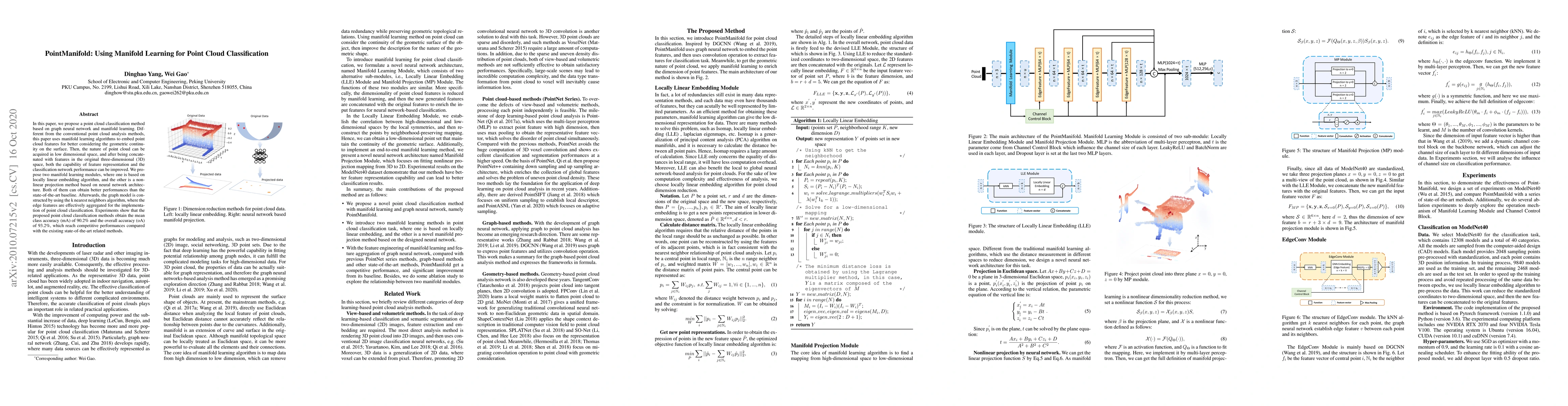 In this paper, we propose a point cloud classification method based on graph neural network and manifold learning. Different from the conventional point cloud analysis methods, this paper uses manifold learning algorithms to embed point cloud features for better considering the geometric continuity on the surface. Then, the nature of point cloud can be acquired in low dimensional space, and after being concatenated with features in the original three-dimensional (3D)space, both the capability of feature representation and the classification network performance can be improved. We pro-pose two manifold learning modules, where one is based on locally linear embedding algorithm, and the other is a non-linear projection method based on neural network architecture. Both of them can obtain better performances than the state-of-the-art baseline. Afterwards, the graph model is constructed by using the k nearest neighbors algorithm, where the edge features are effectively aggregated for the implementation of point cloud classification. Experiments show that the proposed point cloud classification methods obtain the mean class accuracy (mA) of 90.2% and the overall accuracy (oA)of 93.2%, which reach competitive performances compared with the existing state-of-the-art related methods.