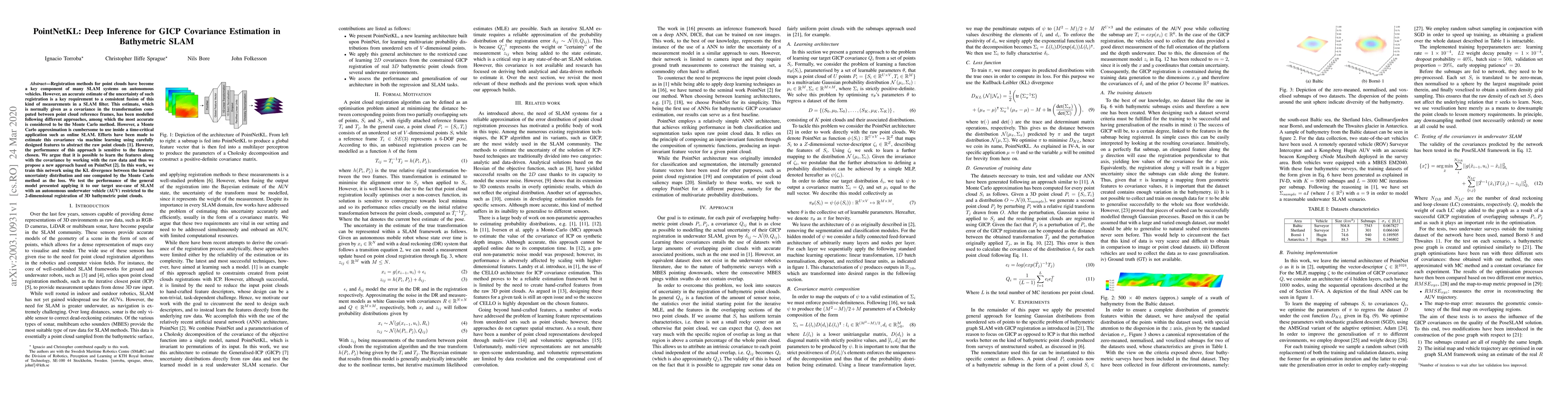 This paper proposes PointNetKL, a deep learning approach for estimating covariance in the registration of point clouds used in SLAM systems, particularly for autonomous underwater vehicles. It aims to learn both features and uncertainty directly from raw data, using KL divergence as a loss function to improve accuracy over traditional methods.