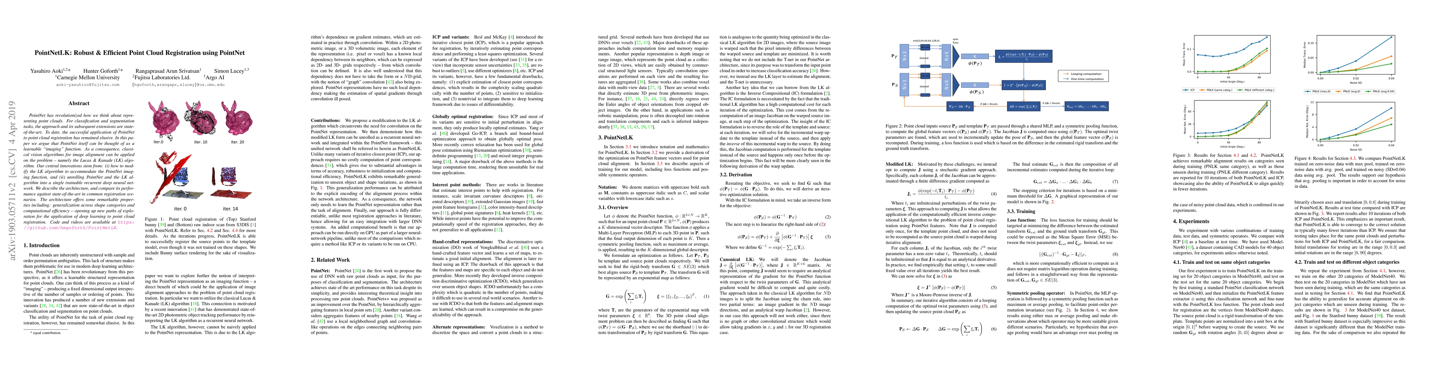 This paper presents PointNetLK, a novel framework for robust and efficient point cloud registration by integrating PointNet with the Lucas & Kanade algorithm. The authors propose modifications to the LK algorithm for PointNet and combine both into a single trainable network, demonstrating generalization and computational efficiency compared to state-of-the-art methods.