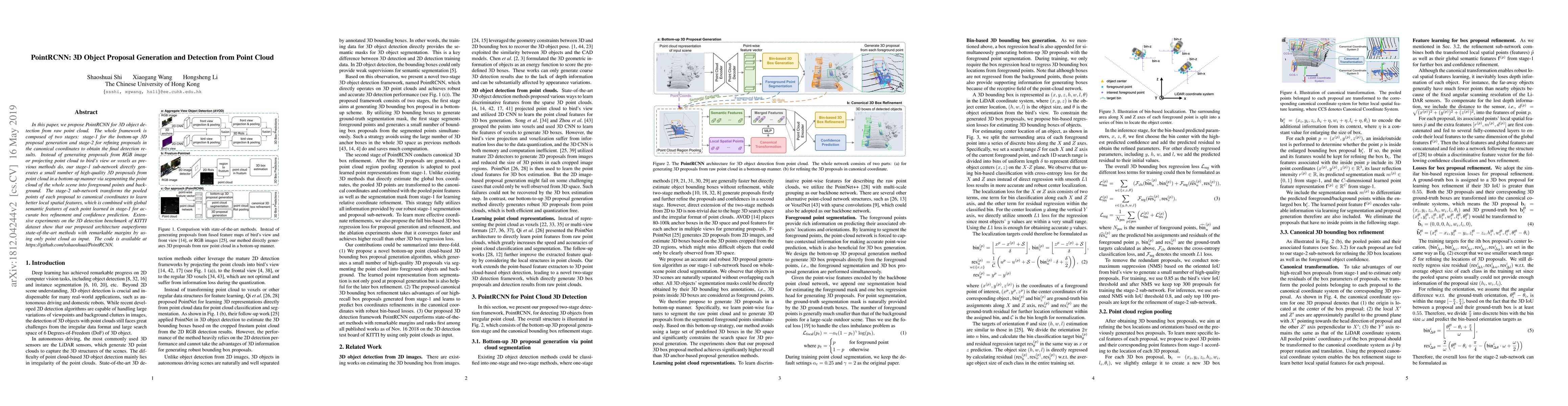 In this paper, we propose PointRCNN for 3D object detection from raw point cloud. The whole framework is composed of two stages: stage-1 for the bottom-up 3D proposal generation and stage-2 for refining proposals in the canonical coordinates to obtain the final detection results. Instead of generating proposals from RGB image or projecting point cloud to bird's view or voxels as previous methods do, our stage-1 sub-network directly generates a small number of high-quality 3D proposals from point cloud in a bottom-up manner via segmenting the point cloud of the whole scene into foreground points and background. The stage-2 sub-network transforms the pooled points of each proposal to canonical coordinates to learn better local spatial features, which is combined with global semantic features of each point learned in stage-1 for accurate box refinement and confidence prediction. Extensive experiments on the 3D detection benchmark of KITTI dataset show that our proposed architecture outperforms state-of-the-art methods with remarkable margins by using only point cloud as input. The code is available at https://github.com/sshaoshuai/PointRCNN.
