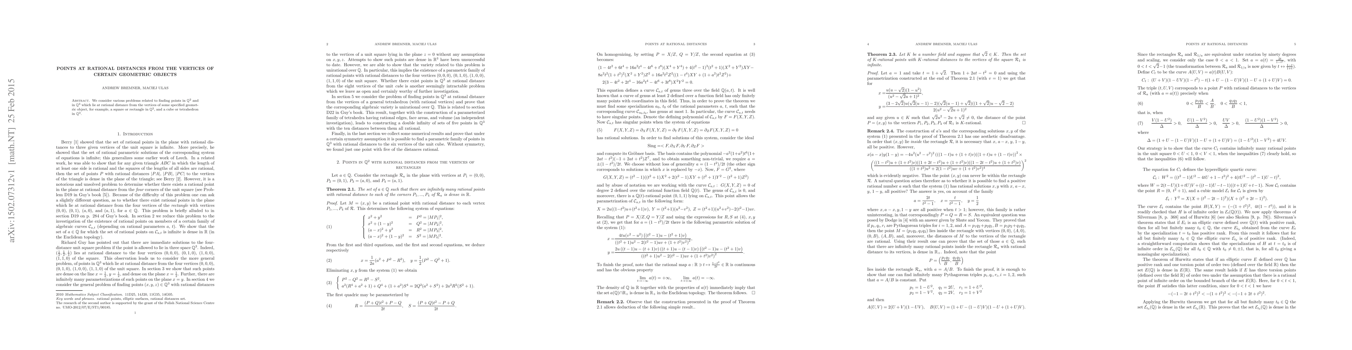 We consider various problems related to finding points in $\Q^{2}$ and in $\Q^{3}$ which lie at rational distance from the vertices of some specified geometric object, for example, a square or rectangle in $\Q^{2}$, and a cube or tetrahedron in $\Q^{3}$.