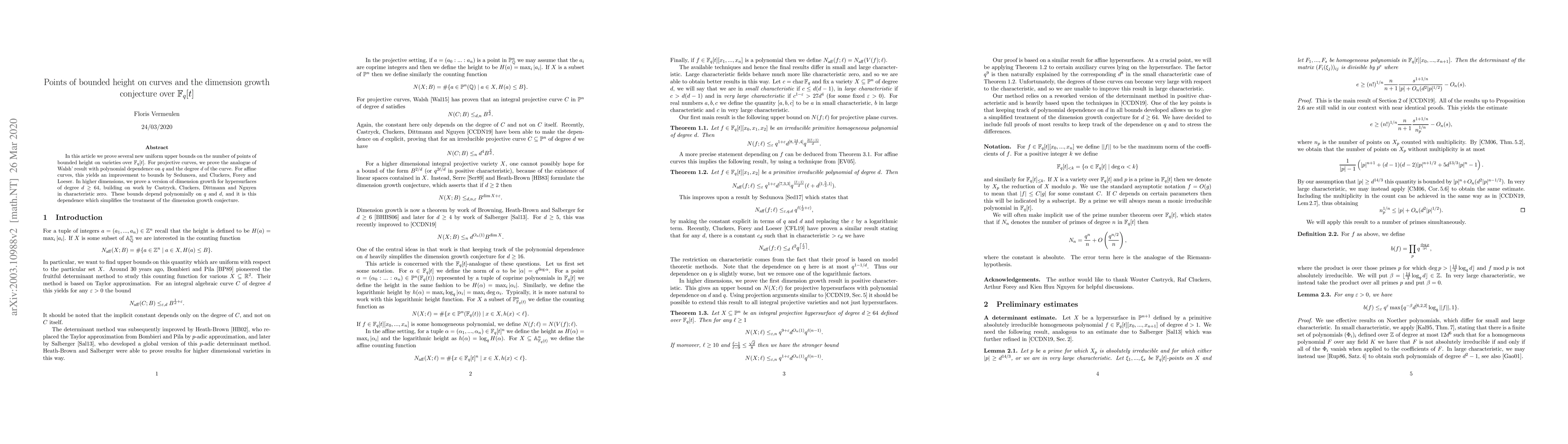 In this article we prove several new uniform upper bounds on the number of points of bounded height on varieties over $\mathbb{F}_q[t]$. For projective curves, we prove the analogue of Walsh' result with polynomial dependence on $q$ and the degree $d$ of the curve. For affine curves, this yields an improvement to bounds by Sedunova, and Cluckers, Forey and Loeser. In higher dimensions, we prove a version of dimension growth for hypersurfaces of degree $d\geq 64$, building on work by Castryck, Cluckers, Dittmann and Nguyen in characteristic zero. These bounds depend polynomially on $q$ and $d$, and it is this dependence which simplifies the treatment of the dimension growth conjecture.