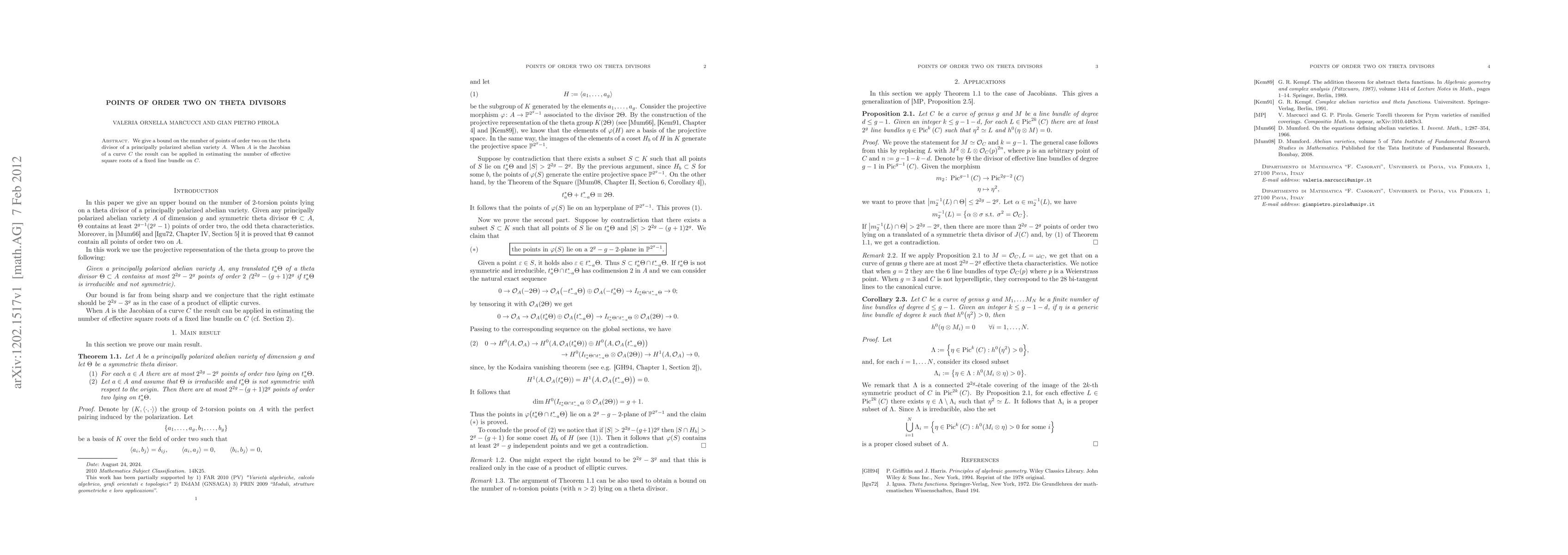 This paper provides a bound on the number of points of order two on the theta divisor of a principally polarized abelian variety, and applies this result to estimate the number of effective square roots of a fixed line bundle on the Jacobian of a curve.