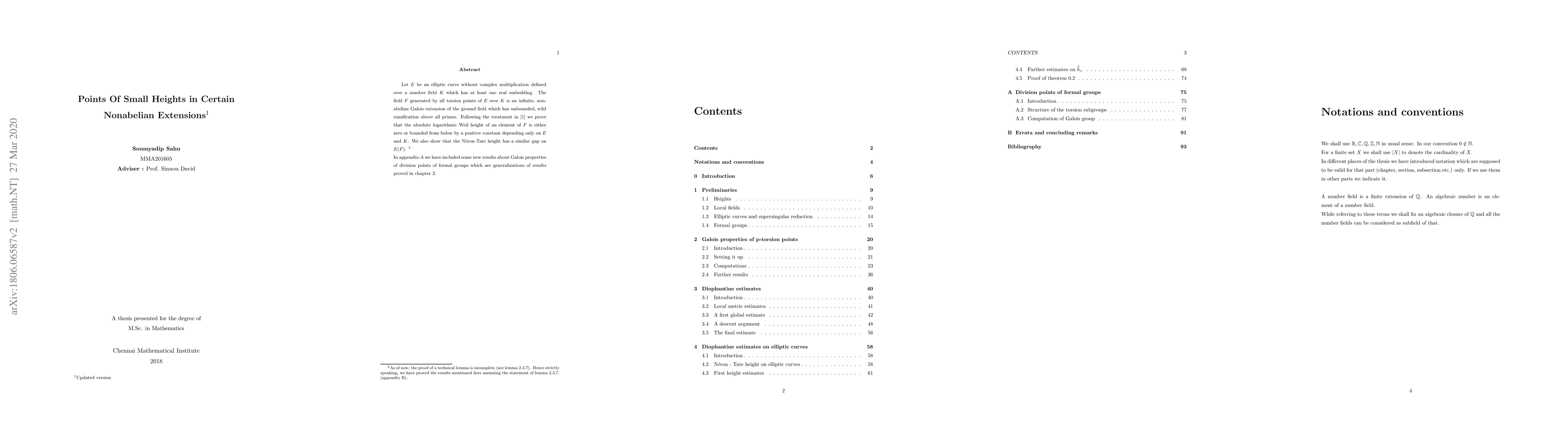 Let $E$ be an elliptic curve without complex multiplication defined over a number field $K$ which has at least one real embedding. The field $F$ generated by all torsion points of $E$ over $K$ is an infinite, non-abelian Galois extension of the ground field which has unbounded, wild ramification above all primes. Following the treatment in 'Small Height And Infinite Nonabelian Extensions' by P. Habegger we prove that the absolute logarithmic Weil height of an element of $F$ is either zero or bounded from below by a positive constant depending only on $E$ and $K$. We also show that the N\'eron-Tate height has a similar gap on $E(F)$. In appendix-A we have included some new results about Galois properties of division points of formal groups which are generalizations of results proved in chapter 2. This work is my M.Sc. thesis submitted to Chennai Mathematical Institute.