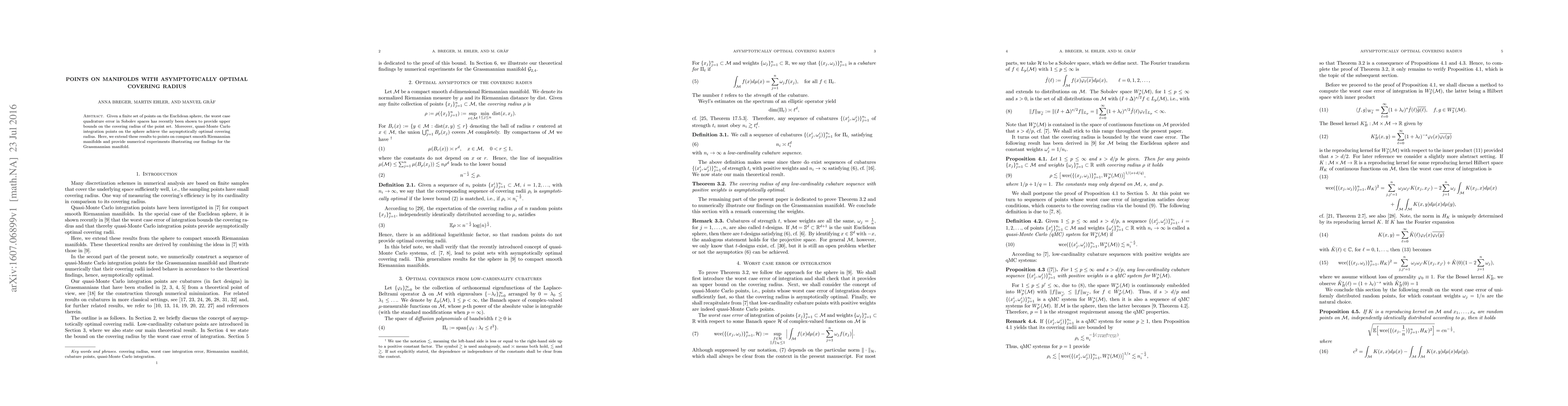 This paper extends the concept of asymptotically optimal covering radius from the Euclidean sphere to compact smooth Riemannian manifolds, demonstrating that quasi-Monte Carlo integration points achieve this optimal radius. Numerical experiments on the Grassmannian manifold illustrate these theoretical findings.