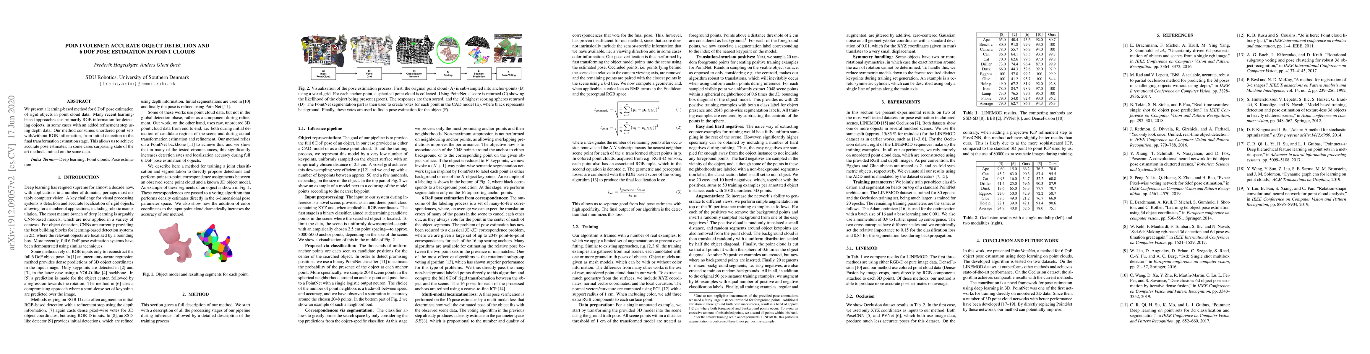 Summary: PointVoteNet is a learning-based method for 6 DoF pose estimation of rigid objects in point cloud data, directly utilizing unordered point sets with or without RGB information, achieving accurate and sometimes superior pose estimates compared to state-of-the-art methods.