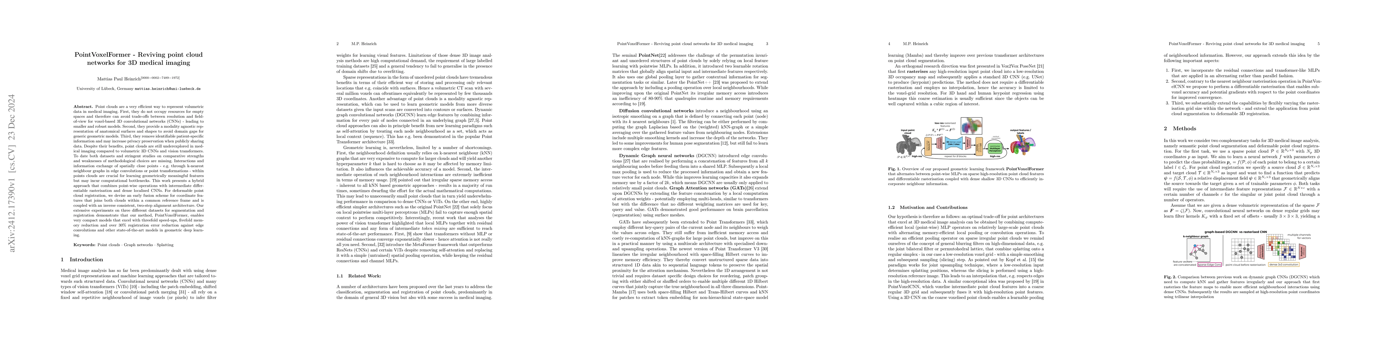 PointVoxelFormer revives point cloud networks for 3D medical imaging by combining point-wise operations with rasterization and CNNs, achieving compact models with speed-ups, memory reduction, and improved registration accuracy compared to state-of-the-art methods. The method also enhances privacy preservation by avoiding patient-specific data.
