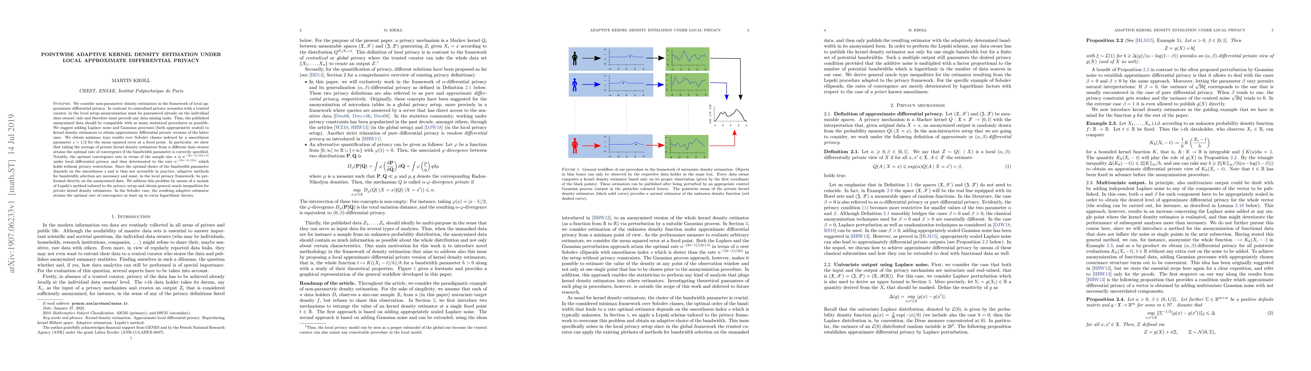 This paper proposes adaptive kernel density estimation methods under local approximate differential privacy, ensuring data anonymization before any data mining. It introduces Laplace noise and Gaussian processes to kernel density estimators, achieving optimal convergence rates despite privacy constraints, and presents adaptive bandwidth selection techniques tailored to the privacy framework.
