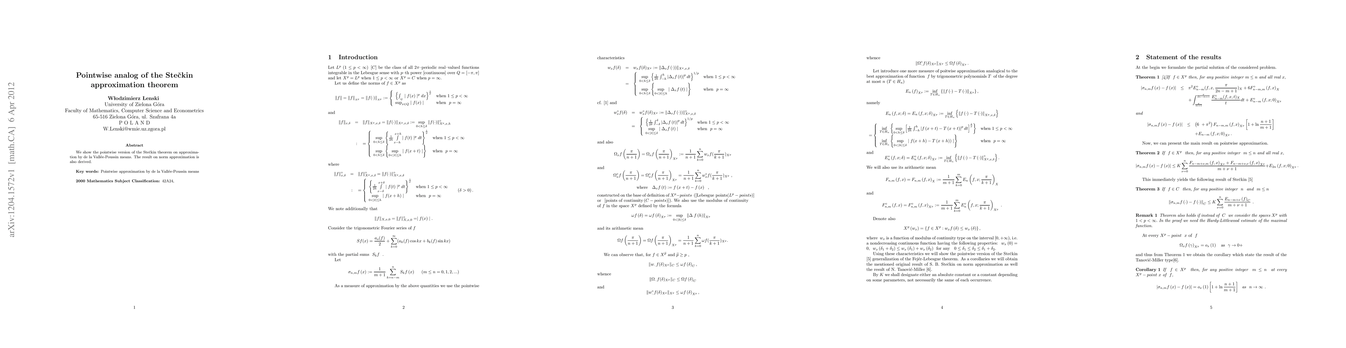 Summary: This paper presents a pointwise version of the Stećkin approximation theorem using de la Vallée-Poussin means, alongside deriving a corresponding result for norm approximation.