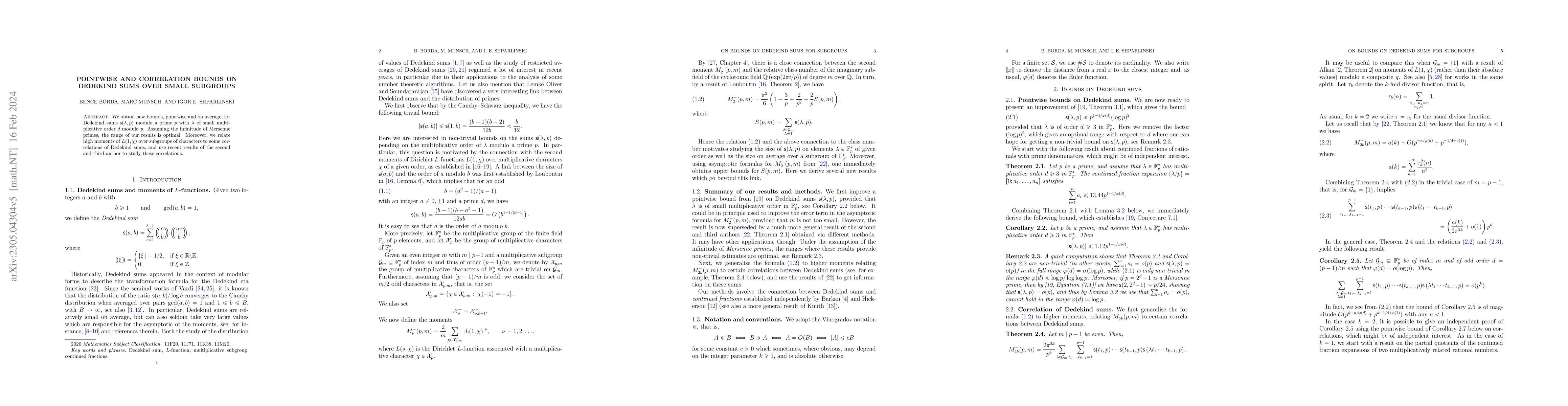 We obtain new bounds, pointwisely and on average, for Dedekind sums $\mathsf{s}(\lambda,p)$ modulo a prime $p$ with $\lambda$ of small multiplicative order $d$ modulo $p$. Assuming the infinitude of Mersenne primes, the range of our results is optimal. Moreover, we relate high moments of $L(1,\chi)$ over subgroups of characters to some correlations of Dedekind sums and use our recent results to study these correlations.