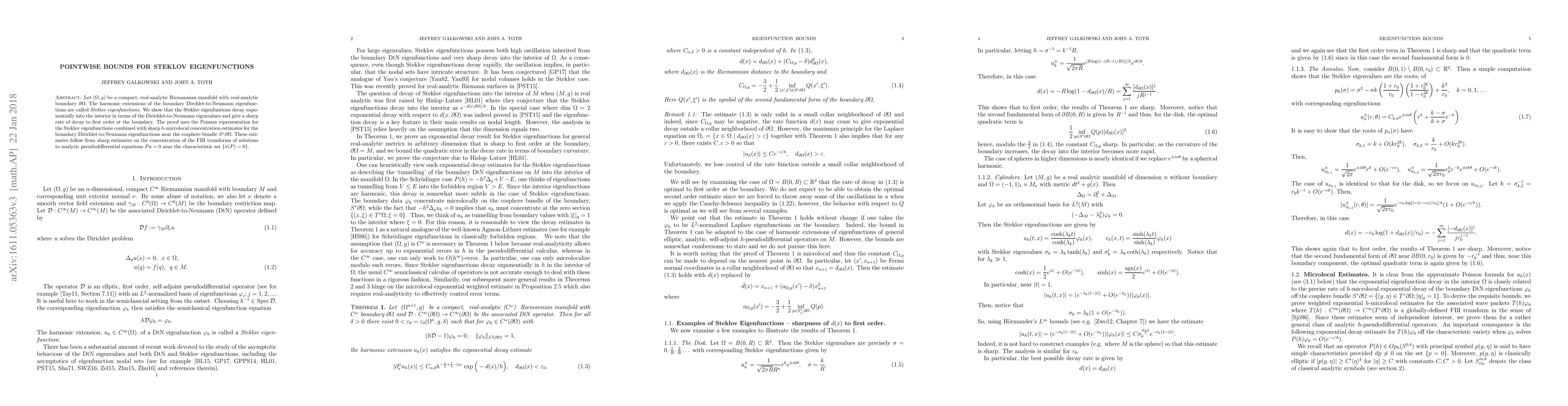 Let $(\Omega,g)$ be a compact, real-analytic Riemannian manifold with real-analytic boundary $\partial \Omega.$ The harmonic extensions of the boundary Dirchlet-to-Neumann eigenfunctions are called Steklov eigenfunctions. We show that the Steklov eigenfuntions decay exponentially into the interior in terms of the Dirichlet-to-Neumann eigenvalues and give a sharp rate of decay to first order at the boundary. The proof uses the Poisson representation for the Steklov eigenfunctions combined with sharp $h$-microlocal concentration estimates for the boundary Dirichlet-to-Neumann eigenfunctions near the cosphere bundle $S^*\partial \Omega.$ These estimates follow from sharp estimates on the concentration of the FBI transforms of solutions to analytic pseudodifferential equations $Pu=0$ near the characteristic set $\{\sigma(P)=0\}$.