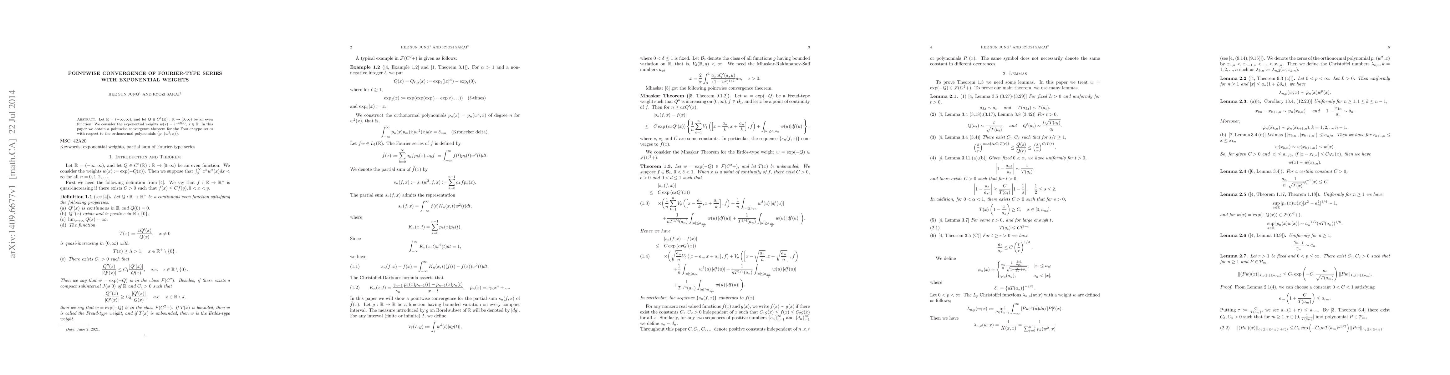 This paper proves pointwise convergence of Fourier-type series with exponential weights to a specific set of orthonormal polynomials. It provides a general framework for analyzing the behavior of such series in terms of an even function Q.