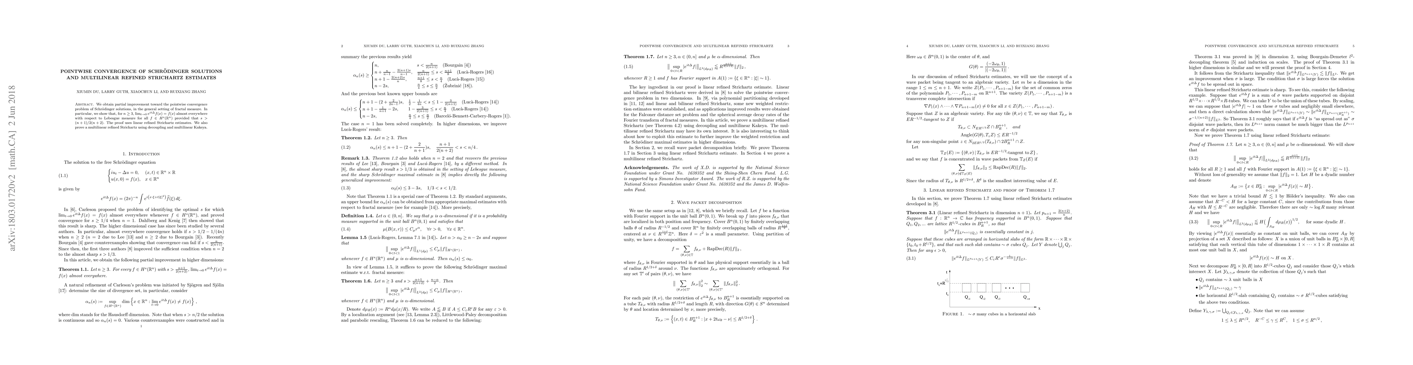 We obtain partial improvement toward the pointwise convergence problem of Schr\"odinger solutions, in the general setting of fractal measure. In particular, we show that, for $n\geq 3$, $\lim_{t \to 0} e^{it\Delta}f(x) = f(x)$ almost everywhere with respect to Lebesgue measure for all $f \in H^s (\mathbb{R}^n)$ provided that $s>(n+1)/2(n+2)$. The proof uses linear refined Strichartz estimates. We also prove a multilinear refined Strichartz using decoupling and multilinear Kakeya.