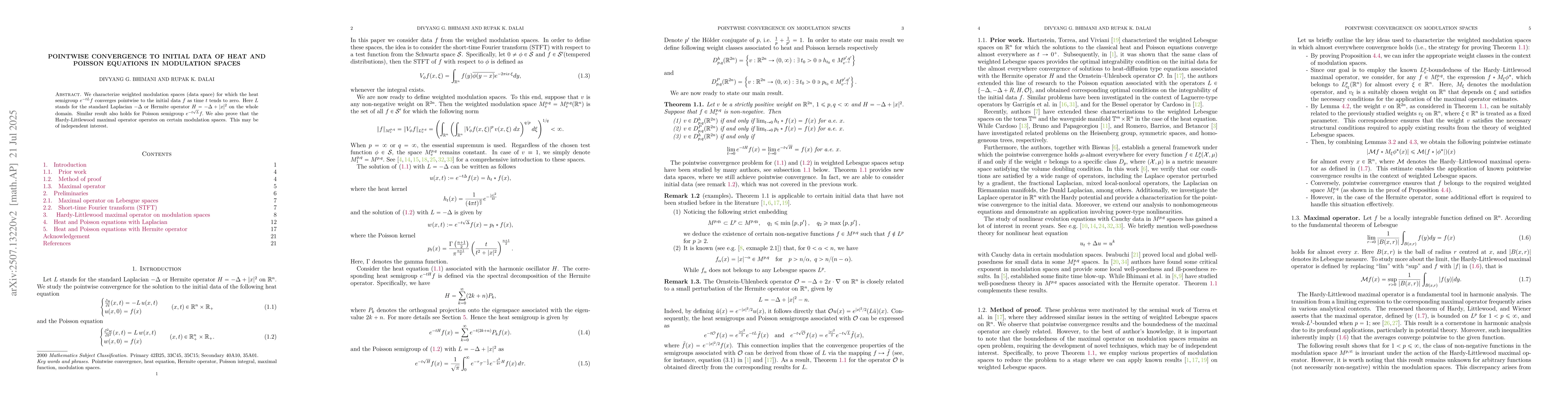 We characterize weighted modulation spaces (data space) for which the heat semigroup $e^{-tL}f$ converges pointwise to the initial data $f$ as time $t$ tends to zero. Here $L$ stands for the standard Laplacian $-\Delta $ or Hermite operator $H=-\Delta +|x|^2$ on the whole domain. Similar result also holds for Poisson semigroup $e^{-t\sqrt{L}}f.$ We also prove that the Hardy-Littlewood maximal operator operates on certain modulation spaces. This may be of independent interest.