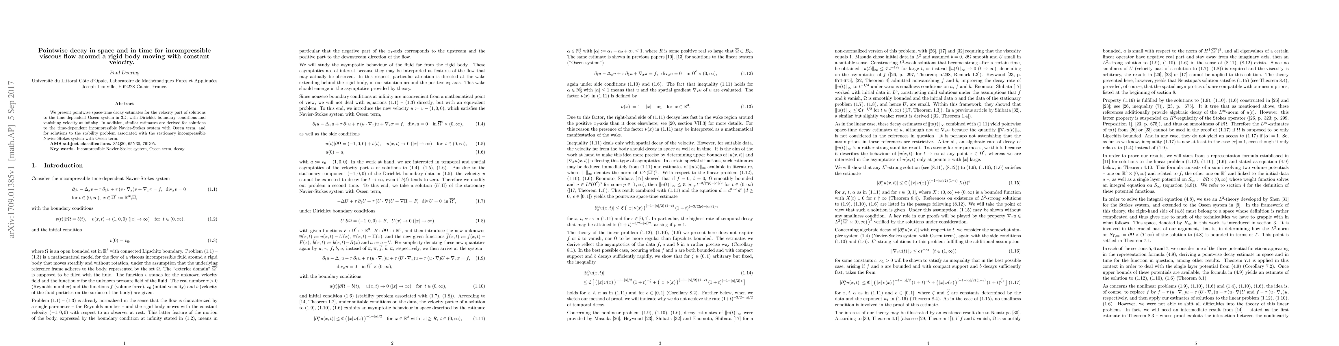 We present pointwise space-time decay estimates for the velocity part of solutions to the time-dependent Oseen system in 3D, with Dirichlet boundary conditions and vanishing velocity at infinity. In addition, similar estimates are derived for solutions to the time-dependent incompressible Navier-Stokes system with Oseen term, and for solutions to the stability problem associated with the stationary incompressible Navier-Stokes system with Oseen term.