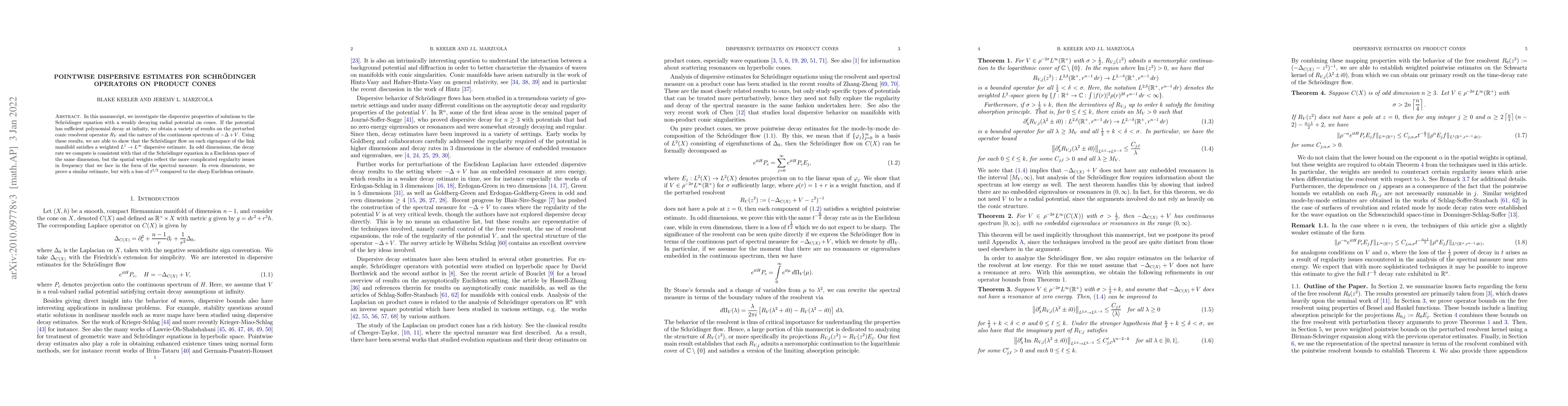 This paper studies the dispersive properties of Schrödinger operators on product cones with weakly decaying radial potentials, proving weighted $L^1\to L^\infty$ dispersive estimates for the Schrödinger flow on each eigenspace. In odd dimensions, the decay rate matches that of Euclidean space, while in even dimensions, a $t^{1/2}$ loss compared to the sharp Euclidean estimate is observed.