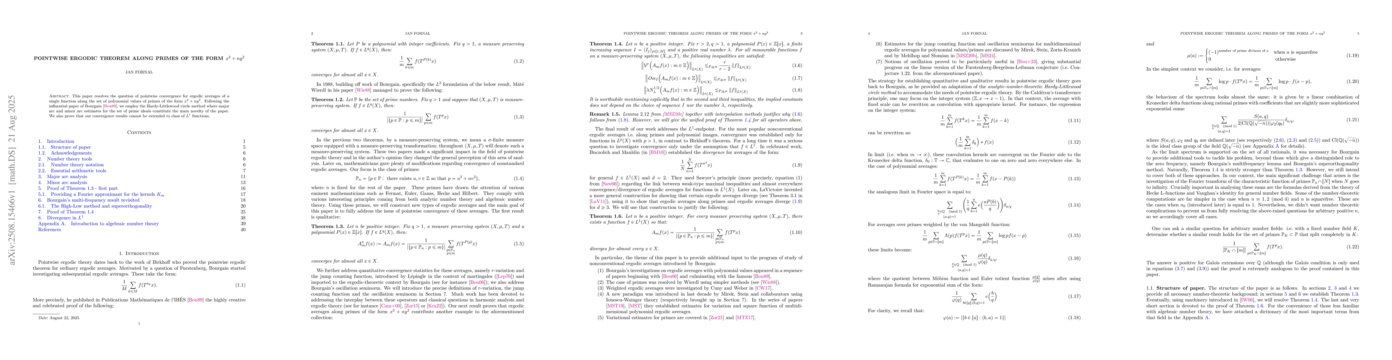 This paper resolves the question of pointwise convergence for ergodic averages of a single function along the set of polynomial values of primes of the form $x^2 + ny^2$. Following the influential paper of Bourgain \cite{bourgain1989pointwise}, we employ the Hardy-Littlewood circle method where major arc and minor arc estimates for the set of prime ideals constitute the main novelty of the paper. We also prove that our convergence results cannot be extended to class of $L^1$ functions.