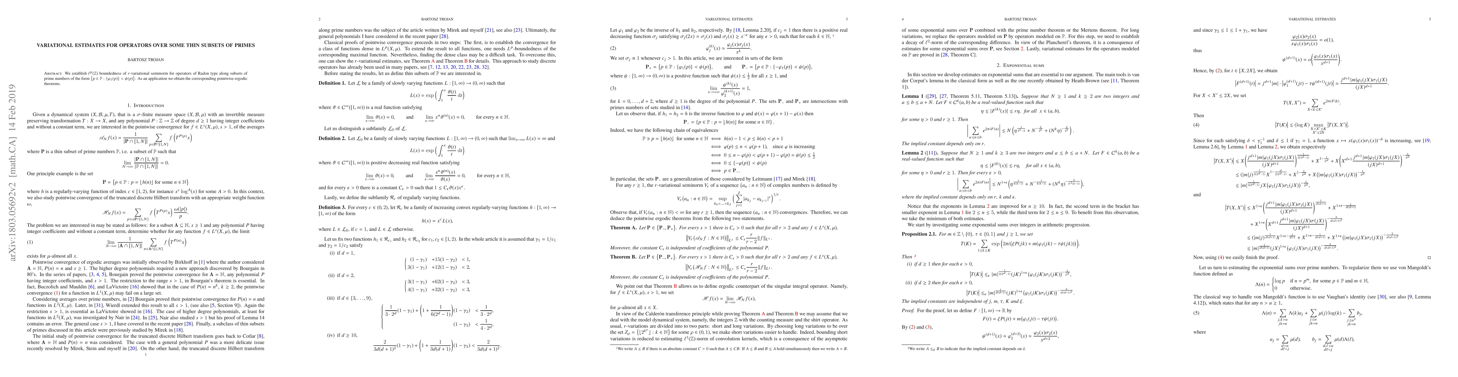 We establish pointwise ergodic theorems for operators of Radon type along subsets of prime numbers of the form $\big\{\{ \varphi_1(n)\} < \psi(n)\big\}$. We achieve this by proving $\ell^p(\mathbb{Z})$ boundedness of $r$-variations, where $p > 1$ and $r > 2$.