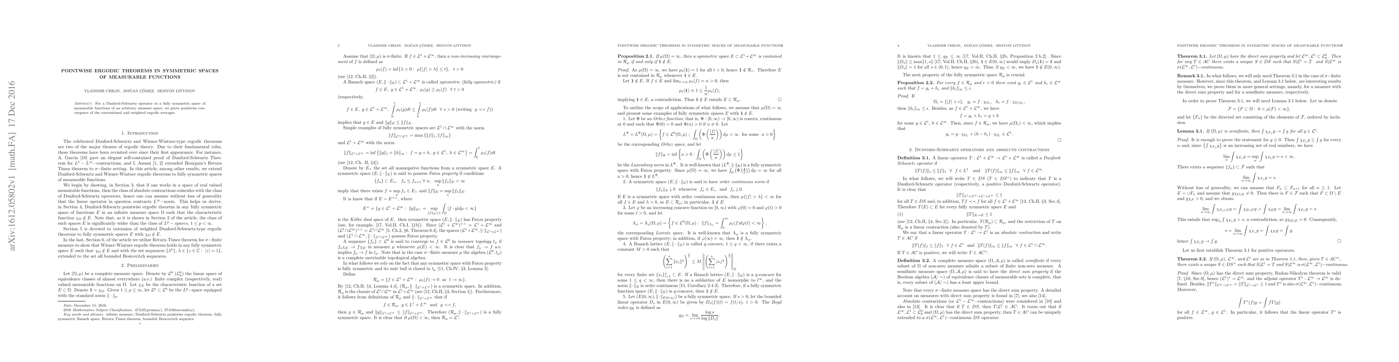 Summary: This paper establishes pointwise convergence theorems for conventional and weighted ergodic averages in symmetric spaces of measurable functions, utilizing Dunford-Schwartz operators on an arbitrary measure space. The results extend classical ergodic theory to a broader functional setting.