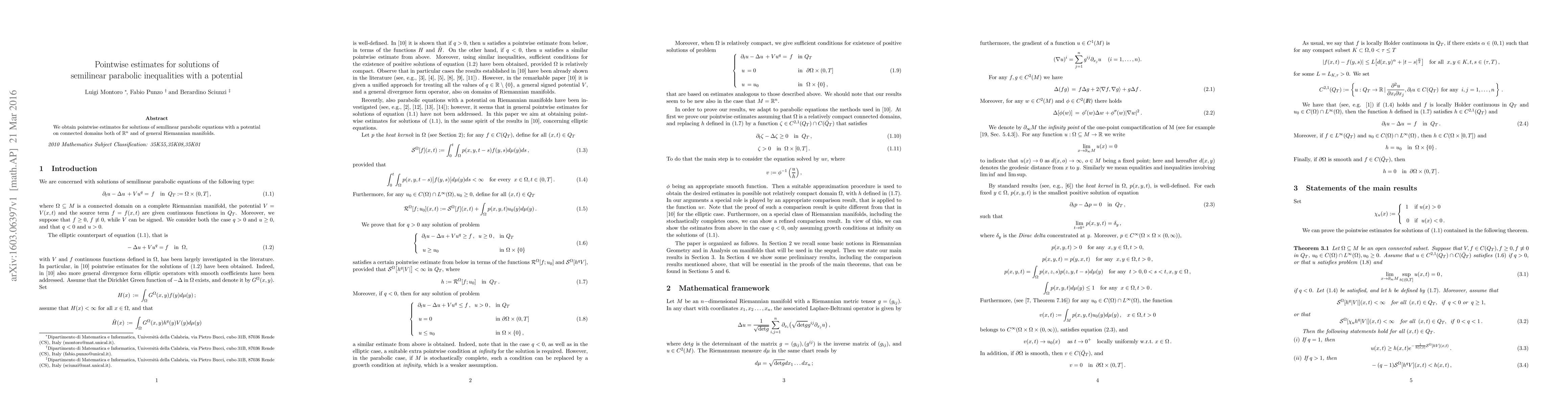 Summary: This paper provides pointwise estimates for solutions of semilinear parabolic equations with a potential in both Euclidean spaces and general Riemannian manifolds. The estimates are derived for connected domains in these settings.