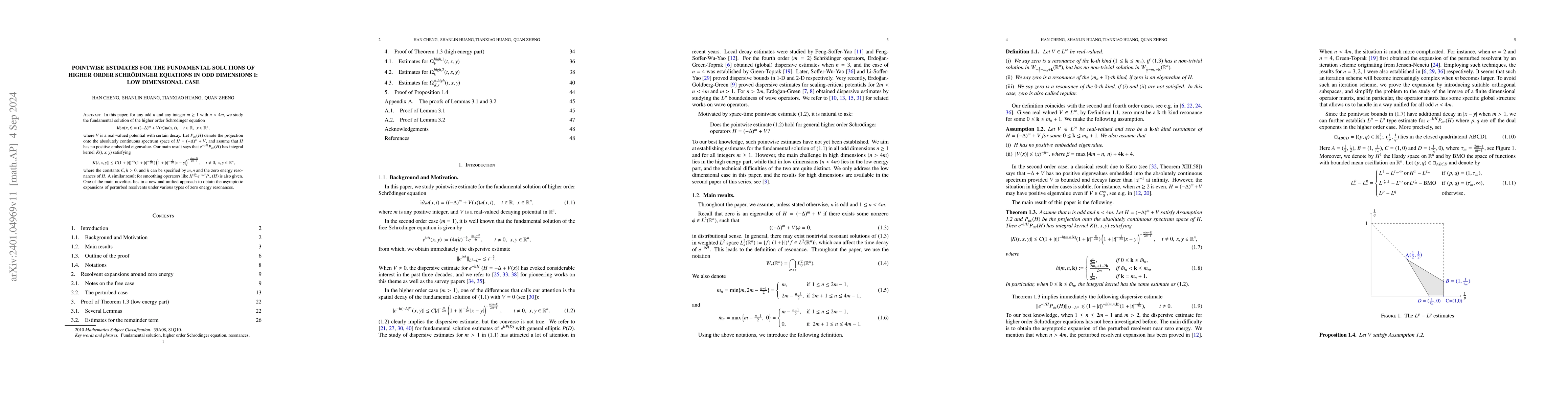 This paper provides pointwise estimates for the fundamental solution of higher-order Schrödinger equations in odd dimensions, demonstrating that the integral kernel of the solution has specific decay behavior. The main result establishes bounds on the kernel in terms of the time variable and spatial separation, which depend on the order of the Laplacian and the spectral properties of the potential.