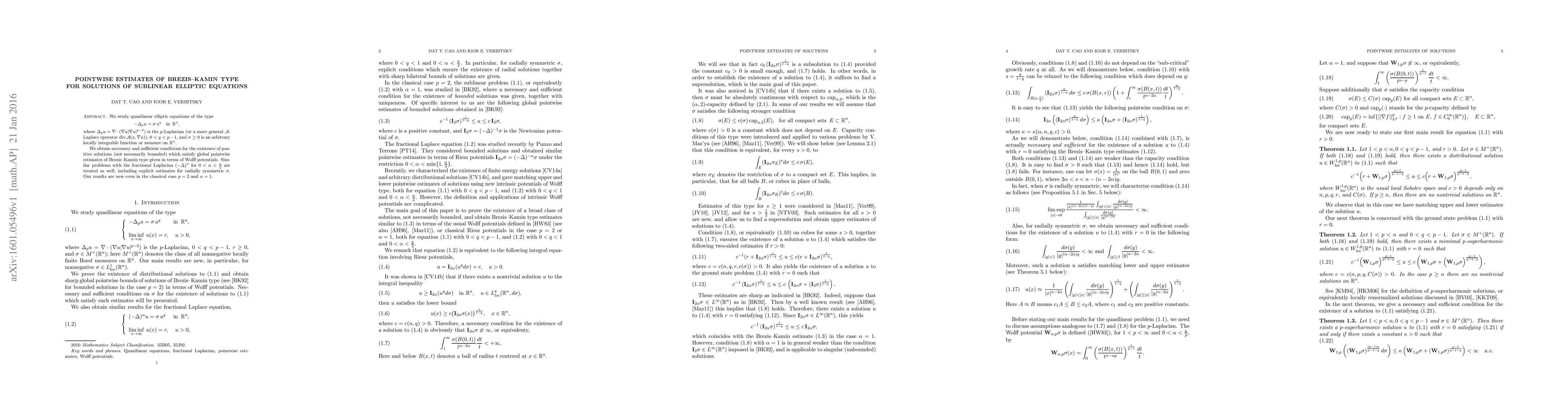 This paper investigates quasilinear elliptic equations involving the $p$-Laplacian and sublinear terms, establishing necessary and sufficient conditions for the existence of positive solutions with global pointwise estimates akin to Brezis-Kamin type, expressed in terms of Wolff potentials. The study also extends to fractional Laplacian cases, providing new results even for the classical $p=2$ scenario.
