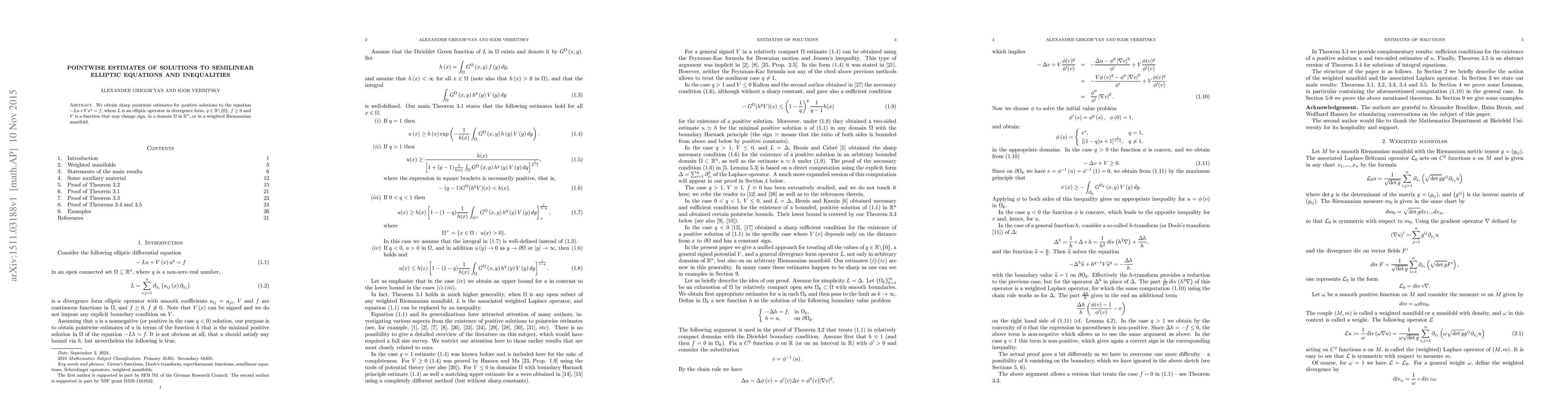 This paper provides sharp pointwise estimates for positive solutions to the semilinear elliptic equation $-Lu+Vu^q=f$ in a domain $\Omega$ or on a weighted Riemannian manifold, where $L$ is a divergence form elliptic operator, $q\neq 0$, $f\geq 0$, and $V$ can change sign.