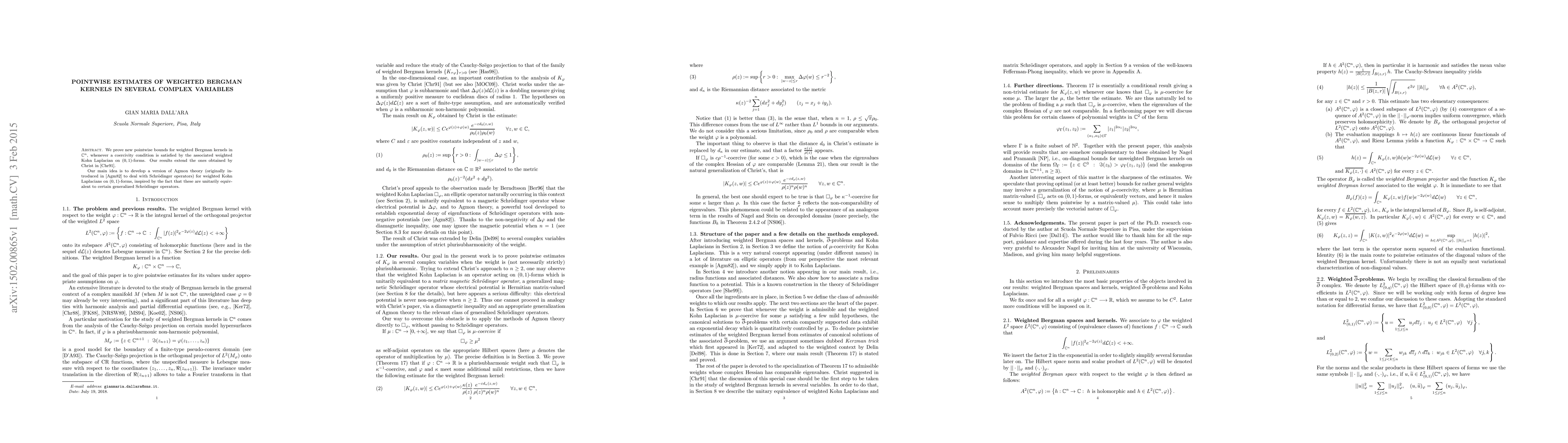 Title: Pointwise estimates of weighted Bergman kernels in several complex variables Summary: New pointwise bounds for weighted Bergman kernels in $\mathbb{C}^n$ are established under a coercivity condition on the weighted Kohn Laplacian, extending previous results in $\mathbb{C}$. The method involves adapting Agmon theory to these Laplacians, leveraging their unitary equivalence to generalized Schrödinger operators.