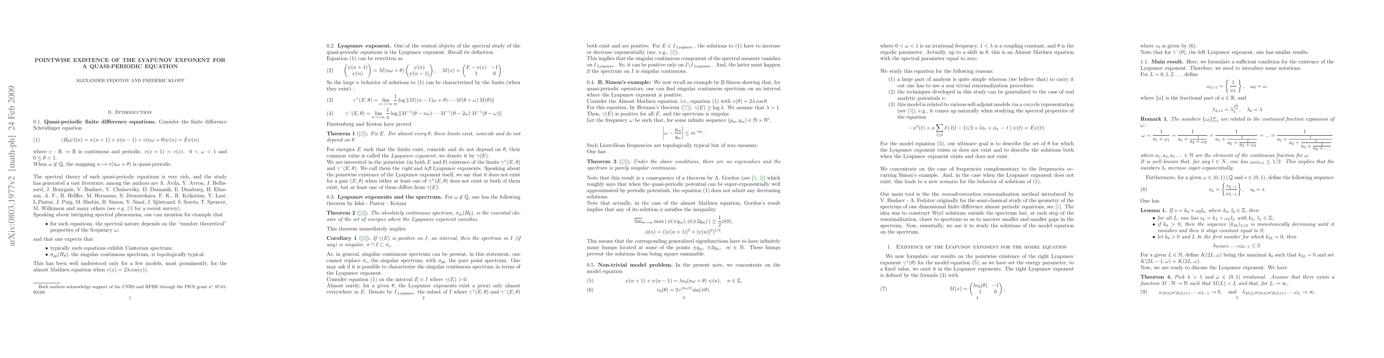 The paper discusses recent findings on the pointwise existence of the Lyapunov exponent for certain quasi-periodic cycles in mathematical equations, highlighting a key aspect of chaotic behavior.