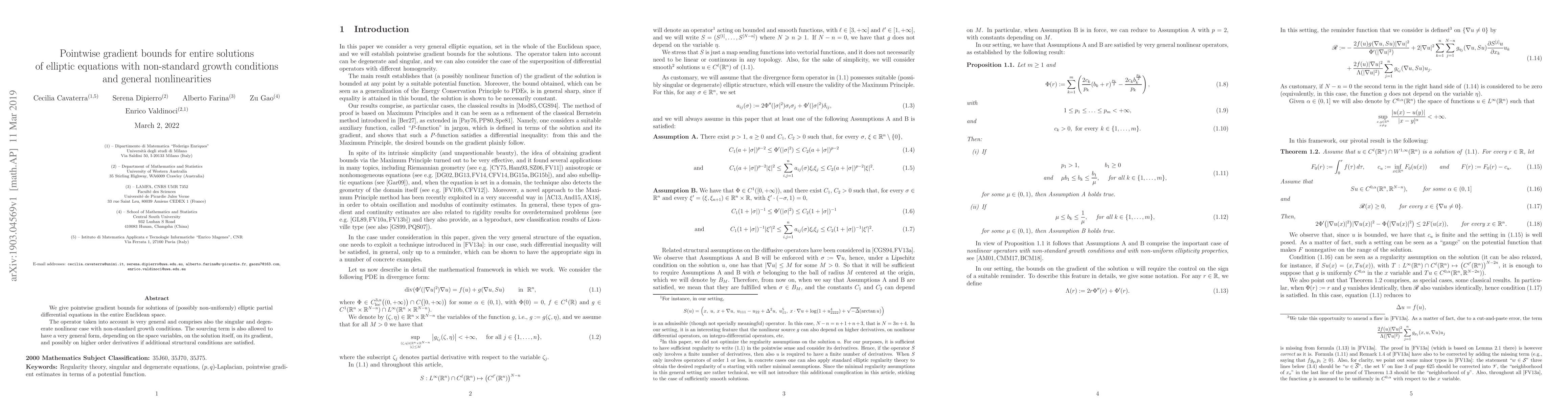 This paper establishes pointwise gradient bounds for entire solutions of general elliptic partial differential equations with non-standard growth conditions and nonlinearities, encompassing both singular and degenerate cases. The analysis allows for a very general form of the sourcing term dependent on space variables, solution, and its gradient.