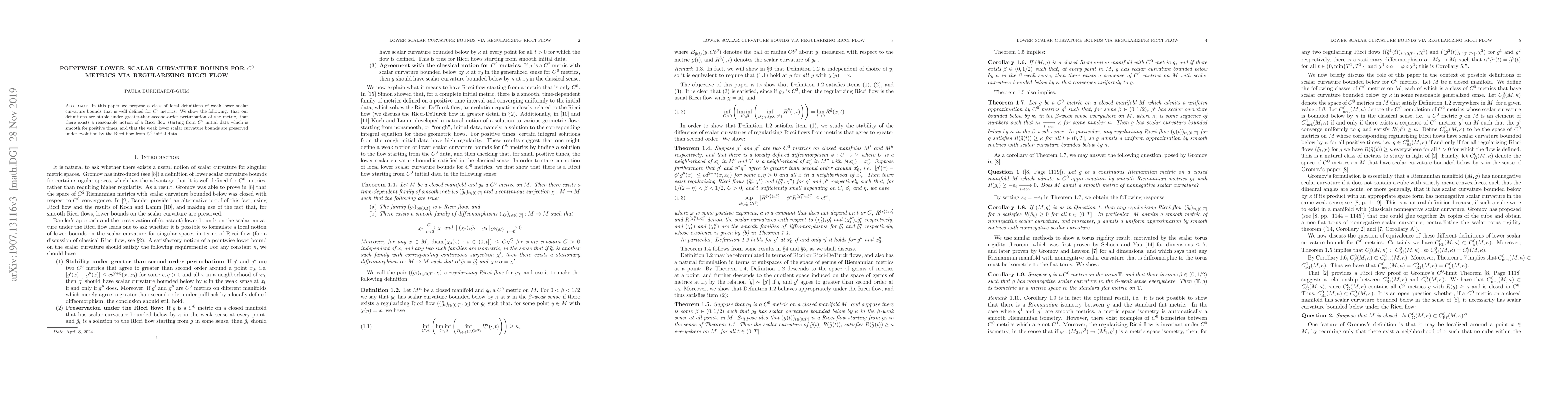 Summary: This paper introduces local definitions for weak lower scalar curvature bounds applicable to $C^0$ metrics, demonstrating stability under high-order metric perturbations, and a smooth Ricci flow evolution preserving these bounds from $C^0$ initial conditions.