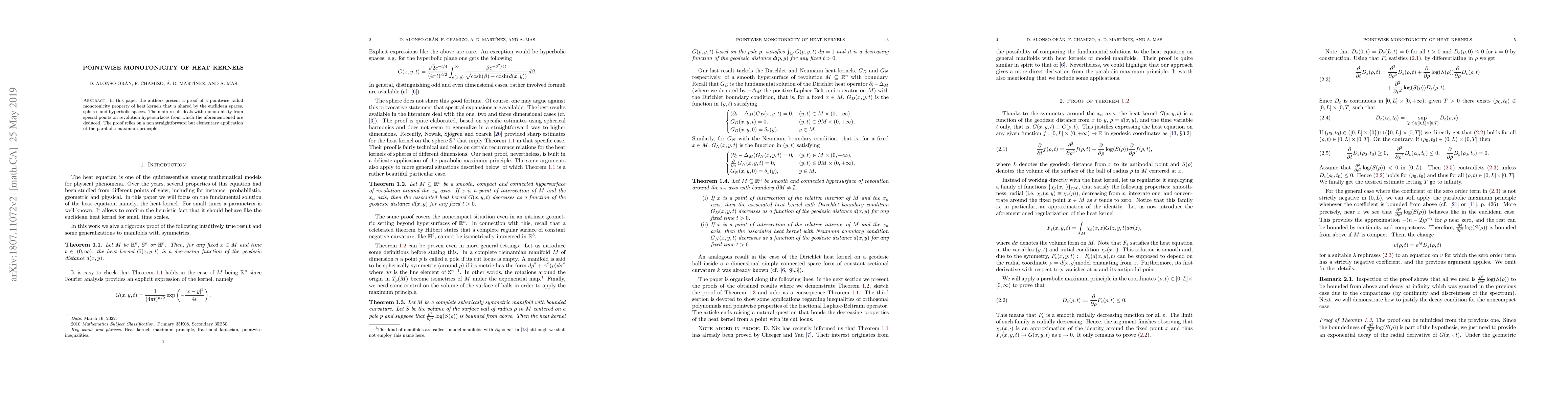 A proof is presented that heat kernels exhibit pointwise radial monotonicity across Euclidean spaces, spheres, and hyperbolic spaces from specific points on revolution hypersurfaces.