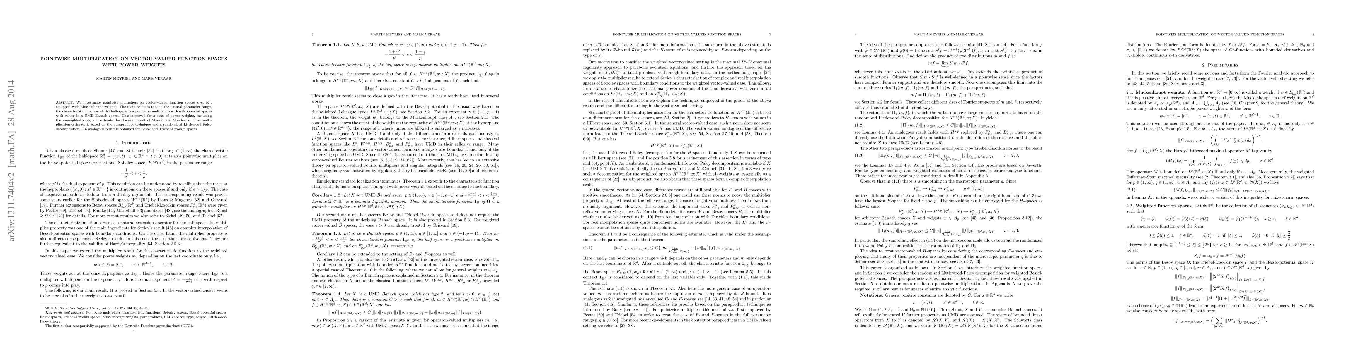 We investigate pointwise multipliers on vector-valued function spaces over $\mathbb{R}^d$, equipped with Muckenhoupt weights. The main result is that in the natural parameter range, the characteristic function of the half-space is a pointwise multiplier on Bessel-potential spaces with values in a UMD Banach space. This is proved for a class of power weights, including the unweighted case, and extends the classical result of Shamir and Strichartz. The multiplication estimate is based on the paraproduct technique and a randomized Littlewood-Paley decomposition. An analogous result is obtained for Besov and Triebel-Lizorkin spaces.