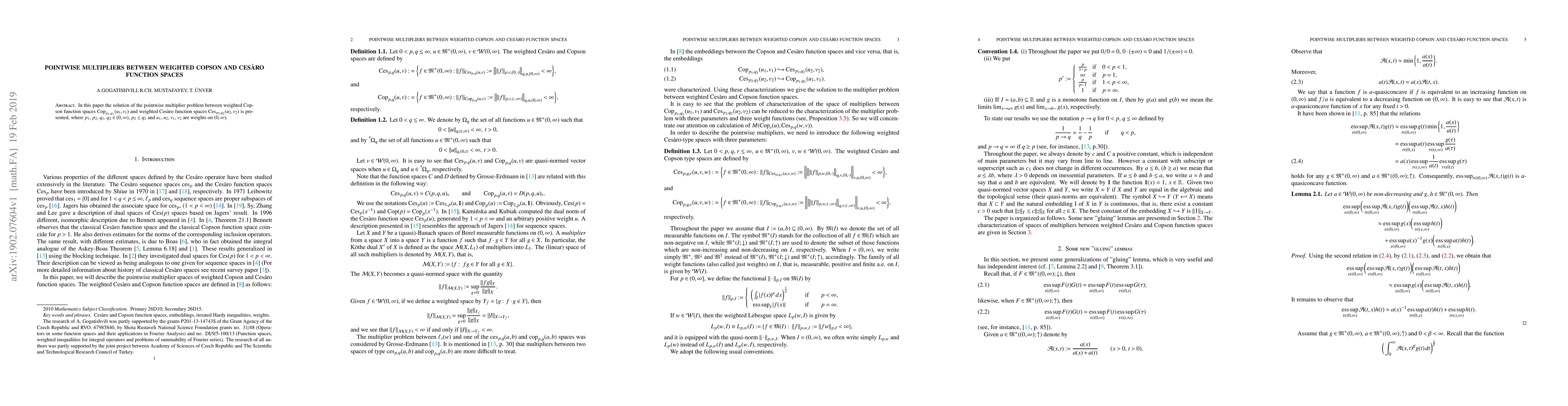 In this paper the solution of the pointwise multiplier problem between weighted Copson function spaces $\operatorname{Cop}_{p_1,q_1}(u_1,v_1)$ and weighted Ces\`{a}ro function spaces $\operatorname{Ces}_{p_2,q_2}(u_2,v_2)$ is presented, where $p_1,\,p_2,\,q_1,\,q_2 \in (0,\infty)$, $p_2 \le q_2$ and $u_1,\,u_2,\,v_1,\,v_2$ are weights on $(0,\infty)$.