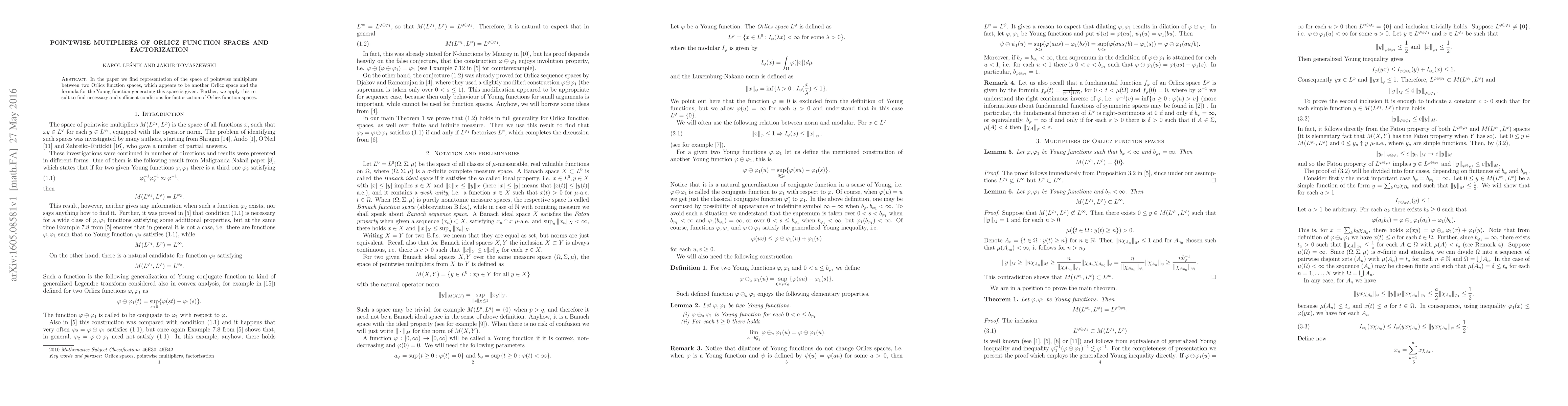 In the paper we find representation of the space of pointwise multipliers between two Orlicz function spaces, which appears to be another Orlicz space and the formula for the Young function generating this space is given. Further, we apply this result to find necessary and suffcient conditions for factorization of Orlicz function spaces.
