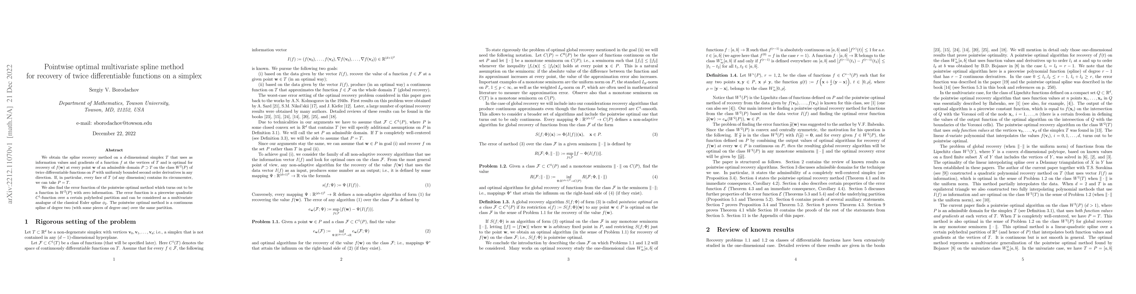 We obtain the spline recovery method on a $d$-dimensional simplex $T$ that uses as information values and gradients of a function $f$ at the vertices of $T$ and is optimal for recovery of $f({\bf w})$ at every point ${\bf w}$ of an admissible domain $P$ containing $T$ on the class $W^2(P)$ of twice differentiable functions on $P$ with uniformly bounded second order derivatives in any direction. If, in particular, every face of $T$ (of any dimension) contains its circumcenter, we can take $P=T$. We also find the error function of the pointwise optimal method which turns out to be a function in $W^2(P)$ with zero information. The error function is a piecewise quadratic $C^1$-function over a certain polyhedral partition and can be considered as a multivariate analogue of the classical Euler spline $\phi_2$. The pointwise optimal method is a continuous spline of degree two (with some pieces of degree one) over the same partition.