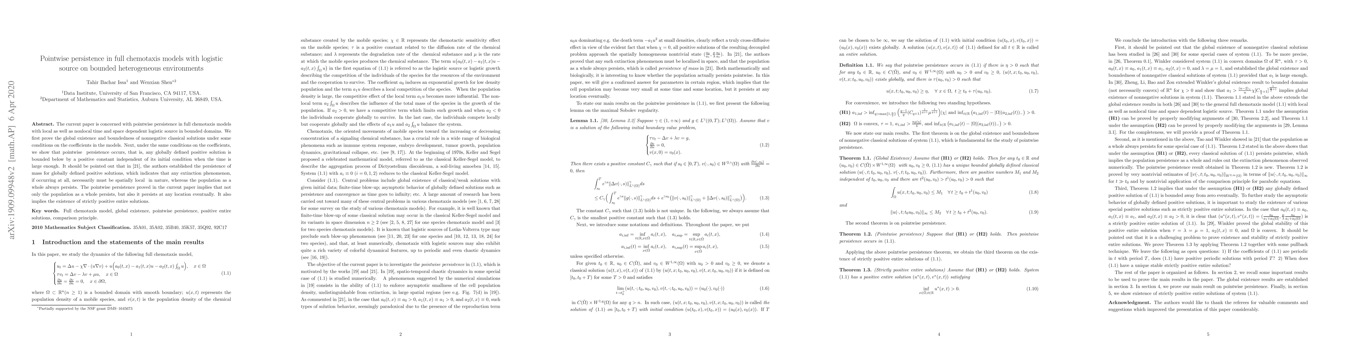The current paper is concerned with pointwise persistence in full chemotaxis models with local as well as nonlocal time and space dependent logistic source in bounded domains. We first prove the global existence and boundedness of nonnegative classical solutions under some conditions on the coefficients in the models. Next, under the same conditions on the coefficients, we show that pointwise { persistence} occurs, that is, any globally defined positive solution is bounded below by a positive constant independent of its initial condition when the time is large enough. It should be pointed out that in \cite{TaoWin15}, the authors established the persistence of mass for globally defined positive solutions, which indicates that any extinction phenomenon, if occurring at all, necessarily must be spatially local { in }nature, whereas the population as a whole always persists. The pointwise persistence proved in the current paper implies that not only the population as a whole persists, but also it persists at any location eventually. It also implies the existence of strictly positive entire solutions.