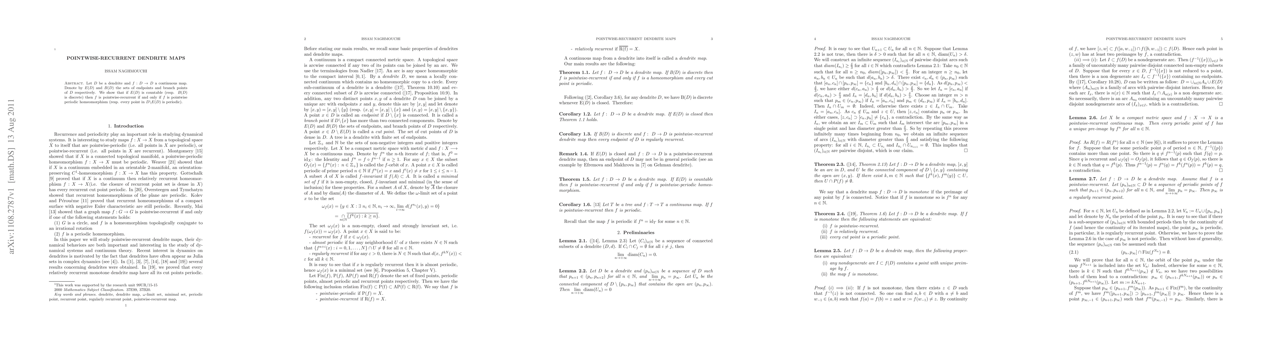 A dendrite map f is pointwise-recurrent if it returns every endpoint to its original point; if endpoints are countable, this happens only when f is also pointwise periodic homeomorphism. Similarly, f is pointwise recurrent if every point except endpoints has period 1.