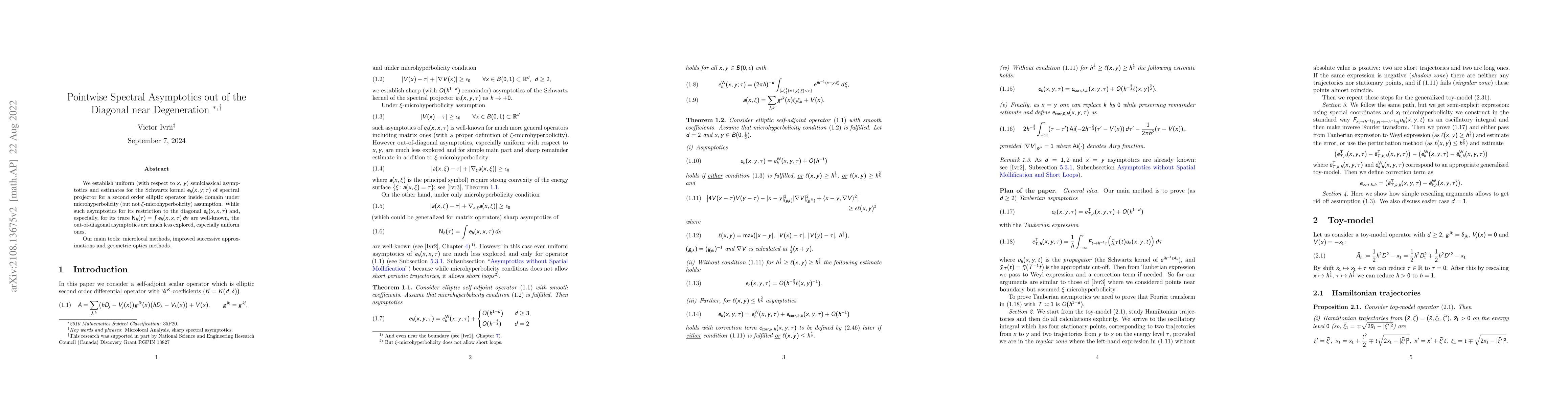 We establish uniform (with respect to $x$, $y$) semiclassical asymptotics and estimates for the Schwartz kernel $e_h(x,y;\tau)$ of spectral projector for a second order elliptic operator inside domain under microhyperbolicity (but not $\xi$-microhyperbolicity) assumption. While such asymptotics for its restriction to the diagonal $e_h(x,x,\tau)$ and, especially, for its trace $\mathsf{N}_h(\tau)= \int e_h(x,x,\tau)\,dx$ are well-known, the out-of-diagonal asymptotics are much less explored, especially uniform ones. Our main tools: microlocal methods, improved successive approximations and geometric optics methods. Our results would also lead to classical asymptotics of $e_h(x,y,\tau)$ for fixed $h$ (say, $h=1$) and $\tau\to \infty$.