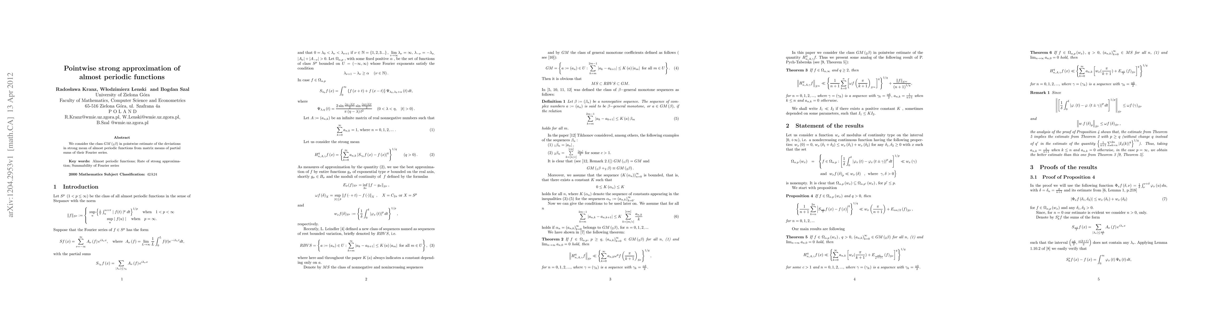 Summary: This paper investigates the pointwise strong approximation of almost periodic functions using matrix means of their Fourier series, focusing on the class GM(2b) to estimate deviations in the strong mean.