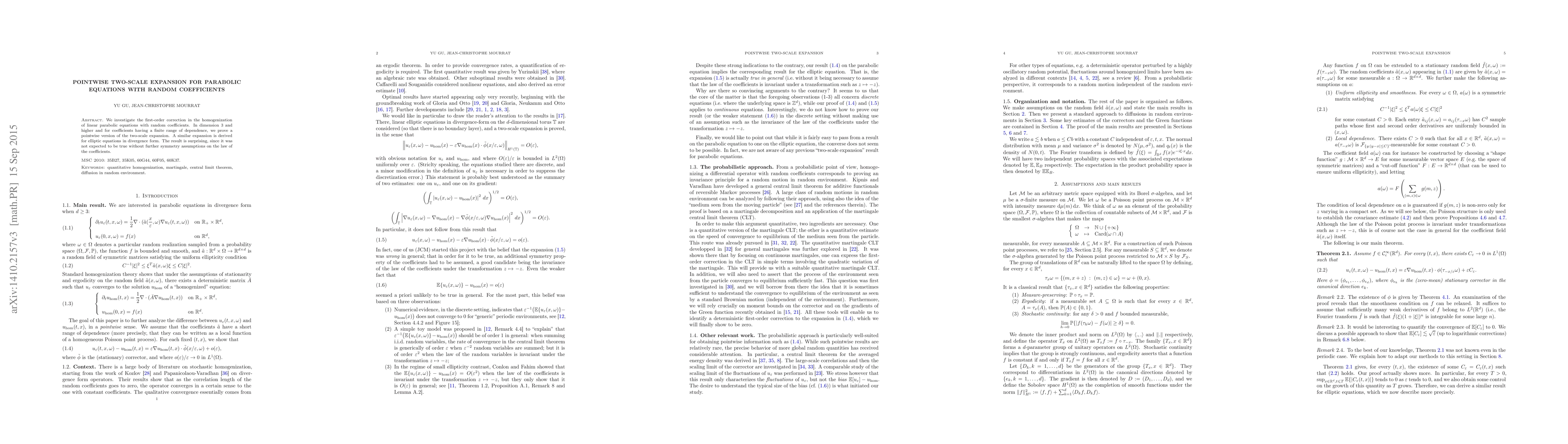 This paper explores the first-order correction in homogenizing linear parabolic equations with random coefficients, proving a pointwise two-scale expansion in dimensions $3$ and higher. The result extends to elliptic equations in divergence form, defying expectations without additional symmetry assumptions on the coefficients.